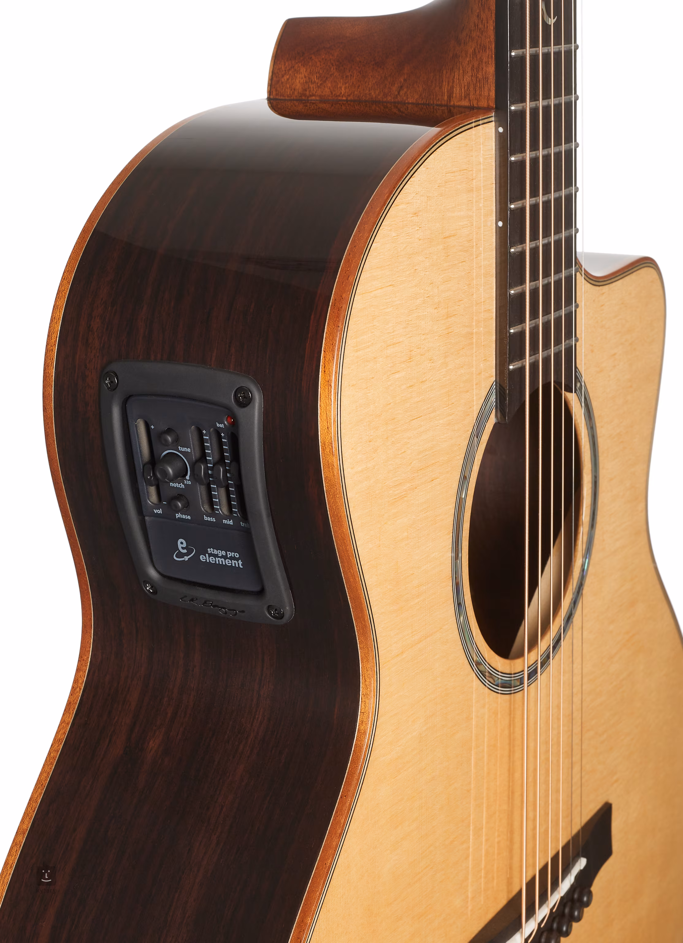Možnost ozvučení nabízí aktivní preamp LR Baggs Stagepro Element v lubu kytary s třípásmovým ekvalizérem, integrovanou ladičkou, notch filtrem pro potlačení efektu zpětné vazby a tlačítkem na obrácení fáze. Kytara je dodávána v kufru.
