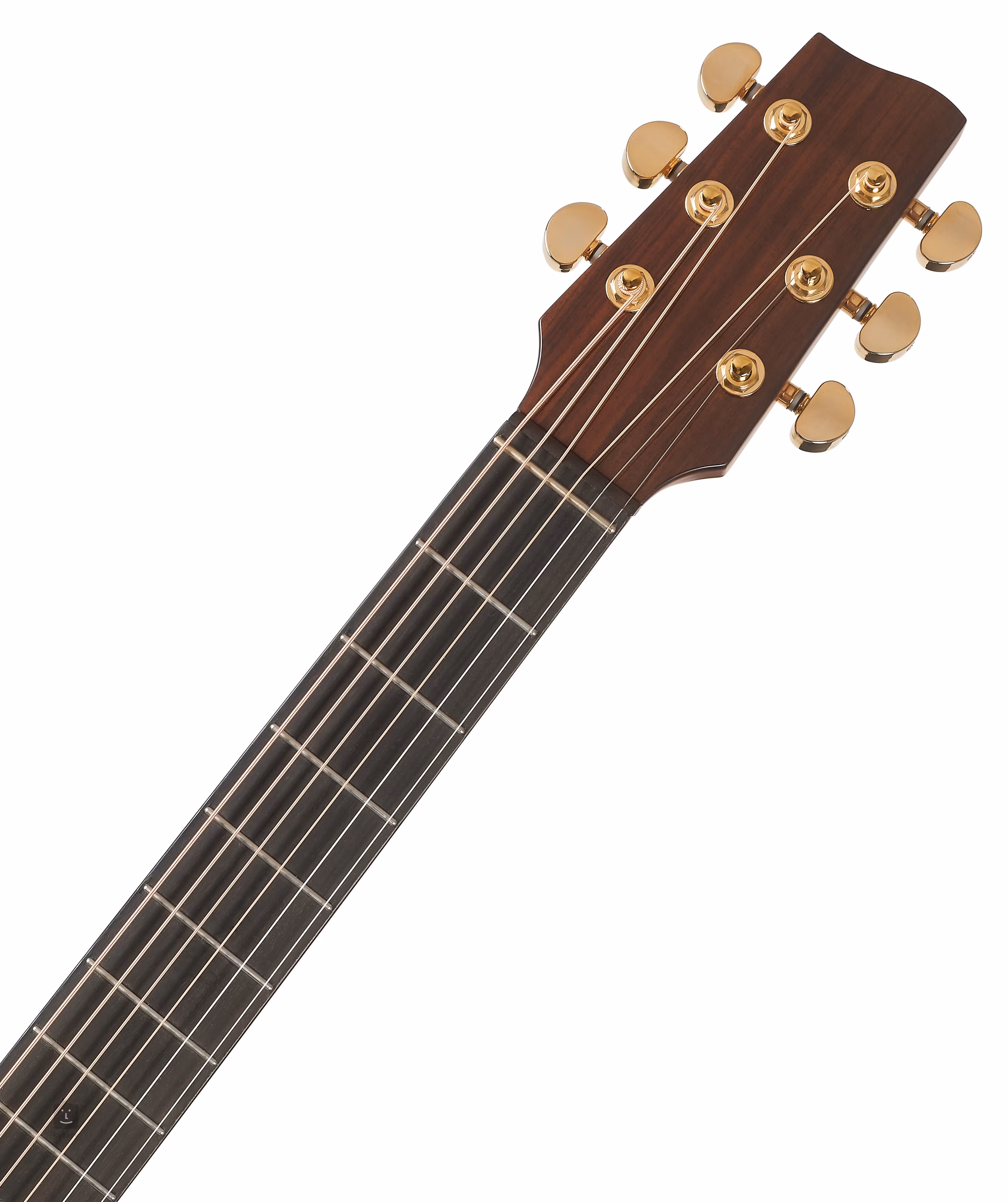 Struny jsou přes ebenový nultý a sedlový pražec z kosti chyceny v ladících mechanikách značky Grover ve zlatém provedení a ebenové kobylce. Pěkné zpracování podtrhuje oboustranná mahagonová lemovka těla, rozeta složená z prstenců ze zeleného abalone a javoru a ebenové kolíčky do kobylky s perleťovými tečkami.