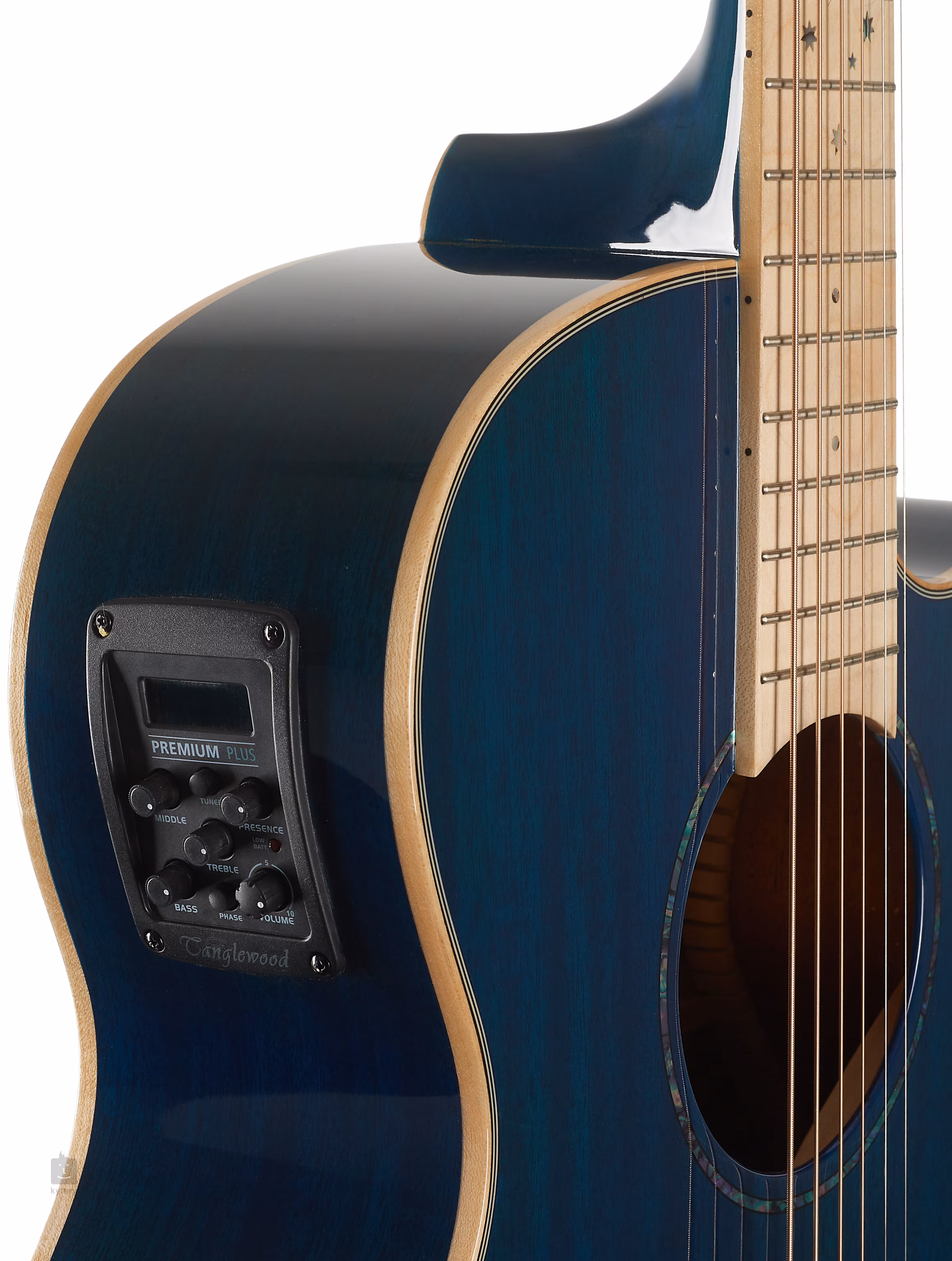 Možnost ozvučení nabízí firemní preamp TW Premium Plus s čtyřpásmovým ekvalizérem, funkcí Phase a zabudovanou ladičkou. Struny jsou přes nultý a sedlový pražec z materiálu NuBone uchyceny v chromovaných die-cast mechanikách a kobylce z kompozitu. Pěkné zpracování podtrhuje javorová lemovka těla, rozeta v dekoru abalonu, středový proužek na zadní desce, perleťové poziční tečky (Mother-of-Pearl) a finiš přední desky Blue Gloss.