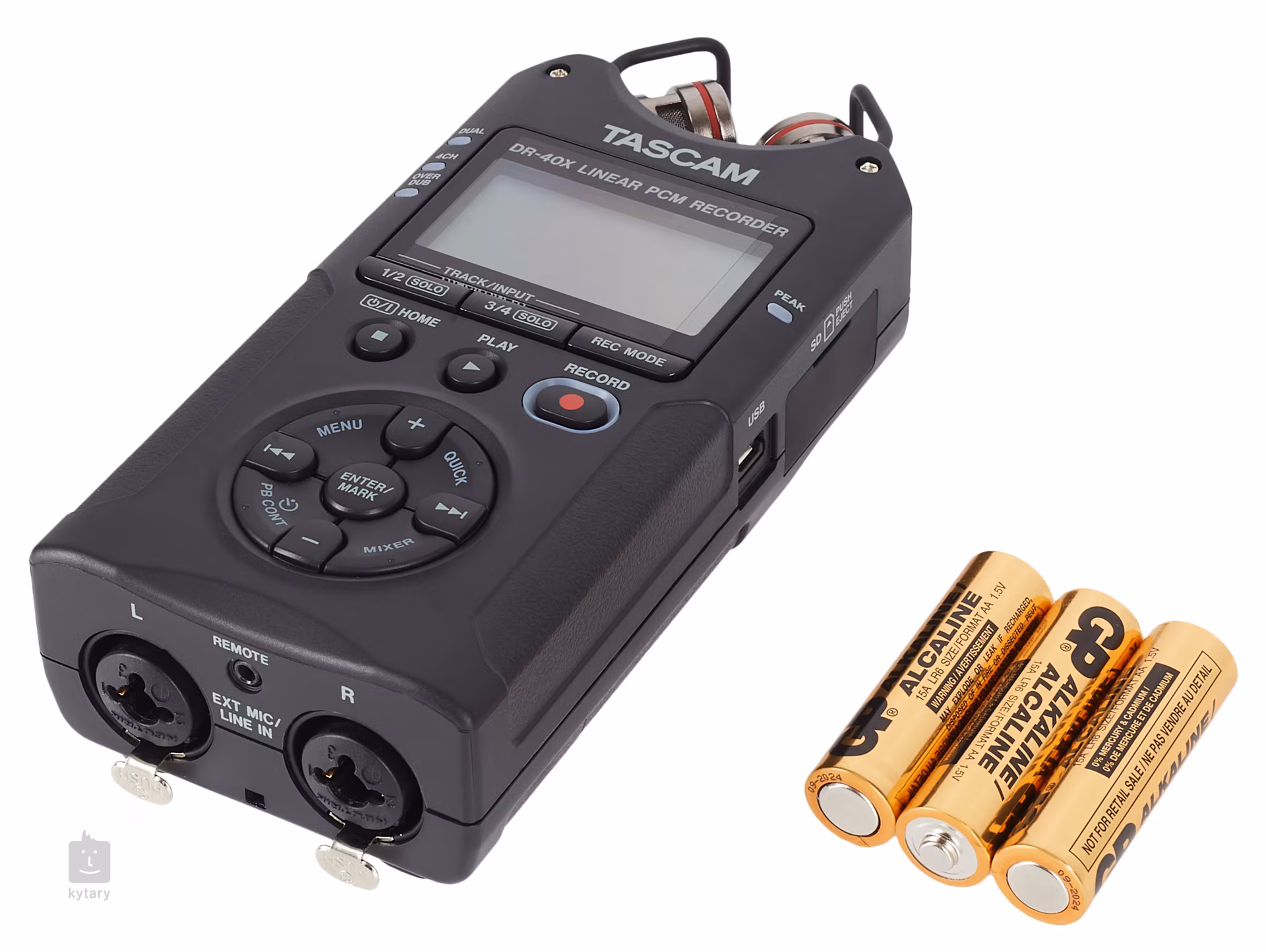 Srdcem Tascam DR-40X jsou dva směrové kondenzátorové mikrofony v A/B nebo X/Y konfiguraci s kardioidní směrovou charakteristikou. Uživatelsky intuitivní ovládání vám umožní rychlé nastavení nahrávání zvukového záznamu. Všechno můžete kontrolovat na přehledném modře podsvíceném displeji. Rekordér také disponuje stereo Kombi XLR/TRS vstupem s fantomovým napájením pro externí mikrofon (lze nahrávat s oběma mikrofony současně), sluchátkovým výstupem a vestavěným reproduktorem pro maximální kontrolu při nahrávání. Propojení s vaším PC dosáhnete přes microUSB výstup. Kapesní rekordér napájí tři AA baterie s výdrží více jak 18 hodin, nebo si můžete dokoupit adaptér PS-P520E a napájet zařízení přímo z elektrické sítě. Při používání rekordéru s digitální zrcadlovkou je možné připojit dálkové ovladání Tascam RC-3F/RC-10.