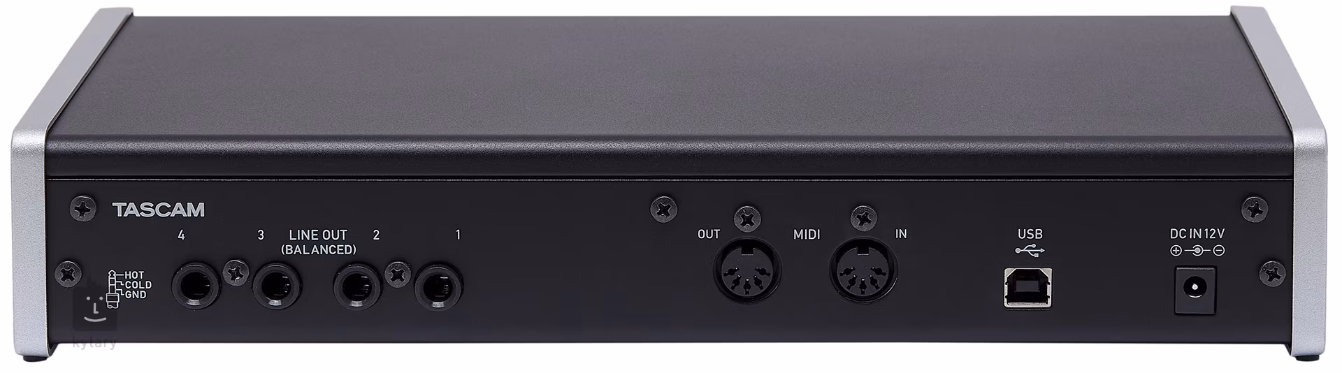Na přední straně najdeme 4 vstupy XLR/TRS, přepínač phantomového napájení, přepínač Mic/Instrumentu každého vstupu, ovladače Gain a ovladač hlasitosti pro výstup do PC, linky a sluchátek. Na zadní straně jsou pak čtyři symetrické TRS výstupy, USB konektor a MIDI In/Out.