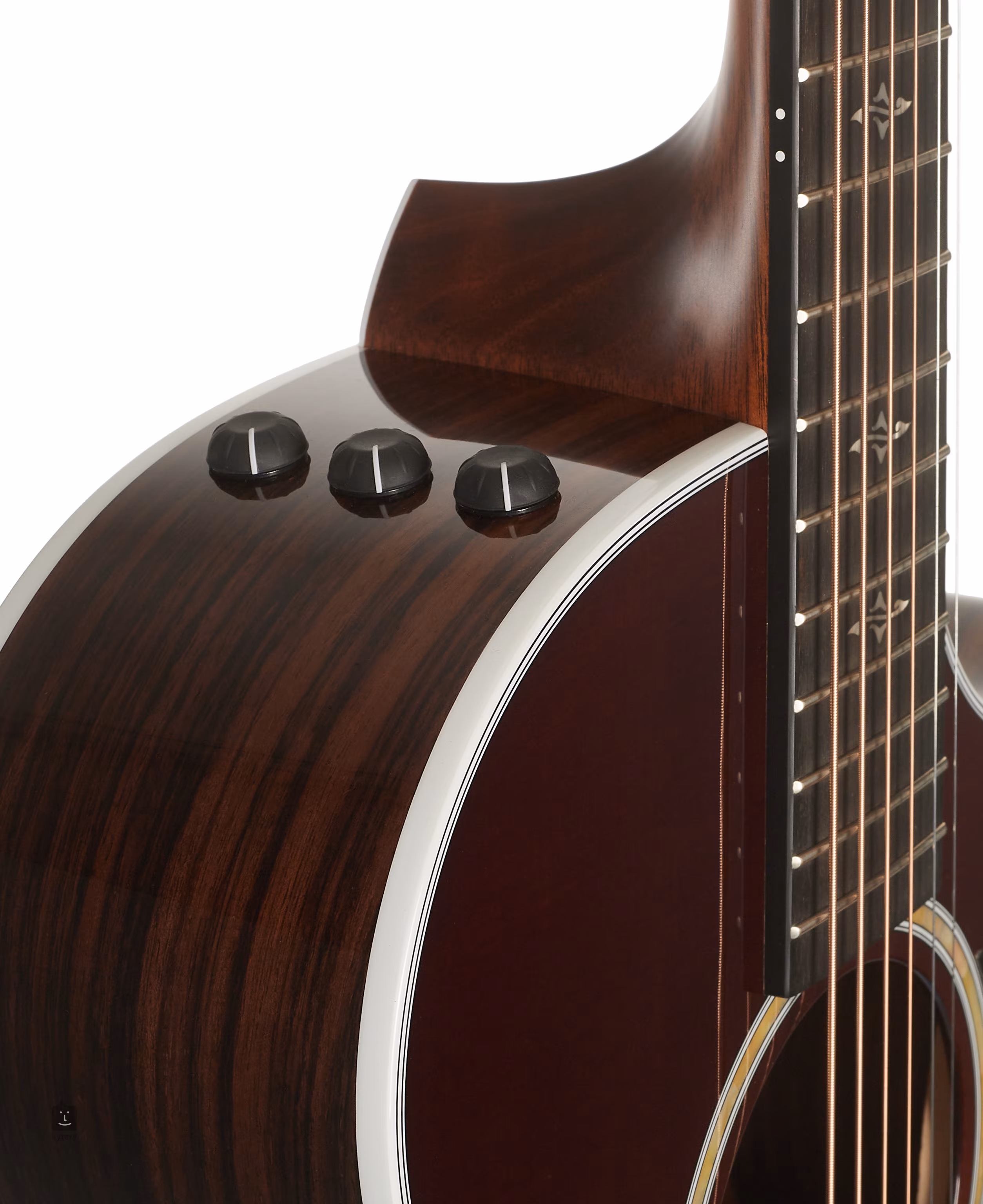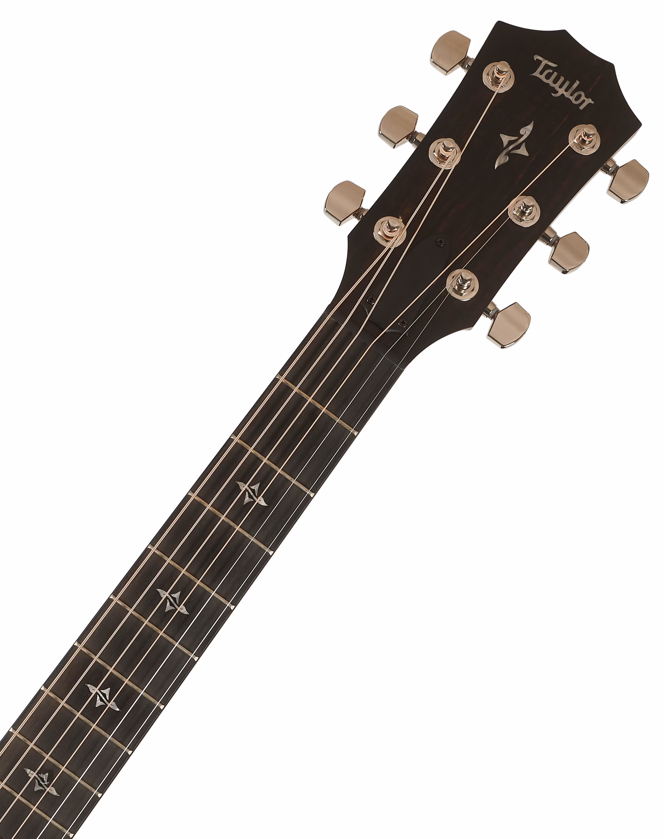 Přední deska kytary je vyrobena ze smrku Sitka, zadní deska a luby jsou zhotoveny z výběrového indického palisandru. Zvukové kvality kytary pozvedává na vyšší úroveň patentované žebrování V-Class, které zvyšuje hlasitost nástroje, prodlužuje sustain a zlepšuje intonaci. K mahagonovém krku je přilepen ebenový hmatník osazený dvaceti pražci. Stabilní ladění zaručuje uchycení strun v mechanikách Taylor a ebenové kobylce. Pěkné zpracování podtrhuje barevná úprava topu Tobacco Sunburst, bílá obvodová lemovka, perleťová rozeta (agoya shell), polohové značky z imitace perleti a pickguard z imitace želvoviny.