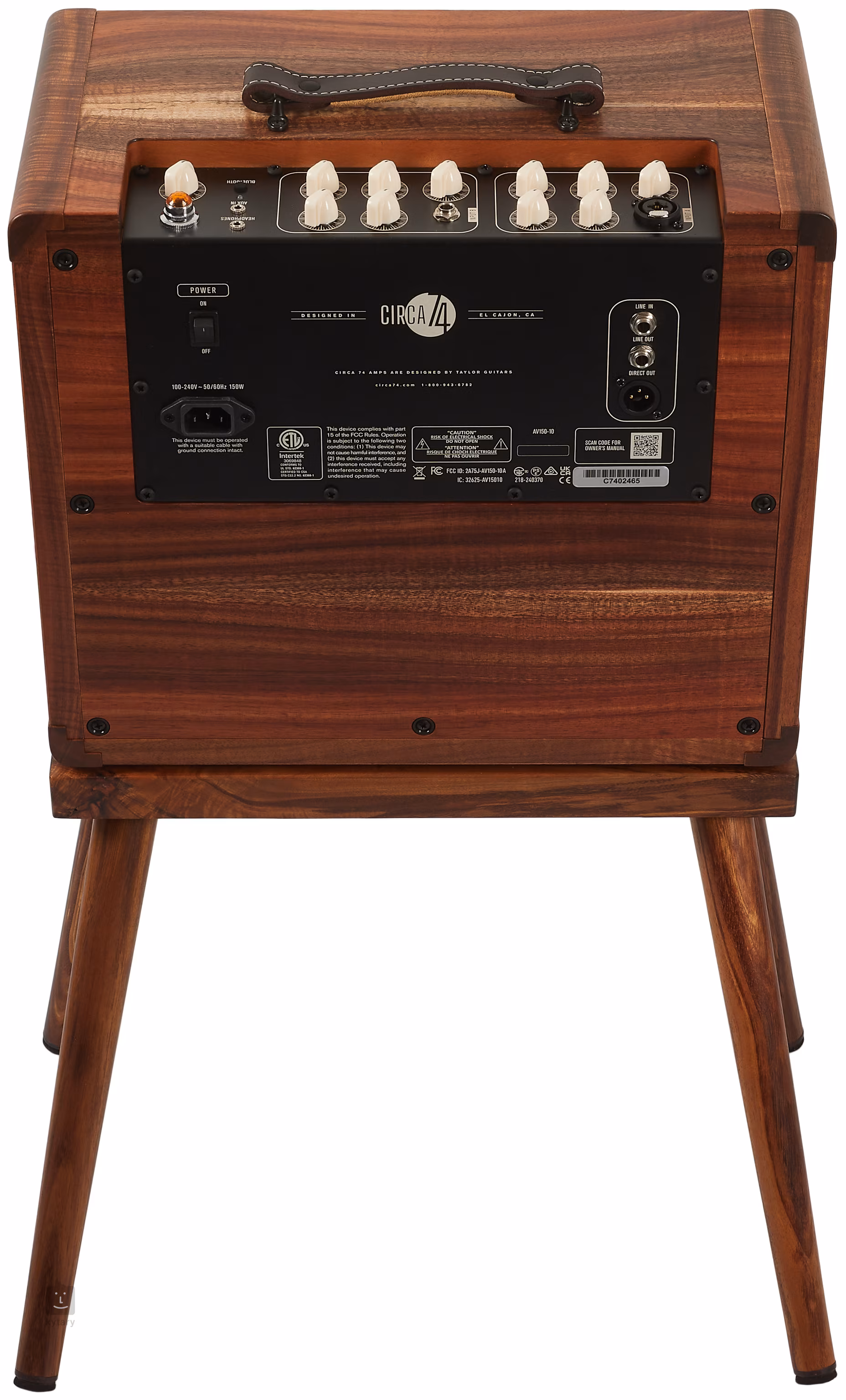 Tranzistorové kombo Koa Circa 74 Amp nabízí maximální výkon 150 wattů, dva samostatné kanály pro kytaru a zpěv s ovladači hlasitosti, třípásmový ekvalizér, zabudovaný efekt reverb (room), jackový 6,3 mm výstup a symetrický XLR výstup, sluchátkový výstup a kompatibilitu s Bluetooth.