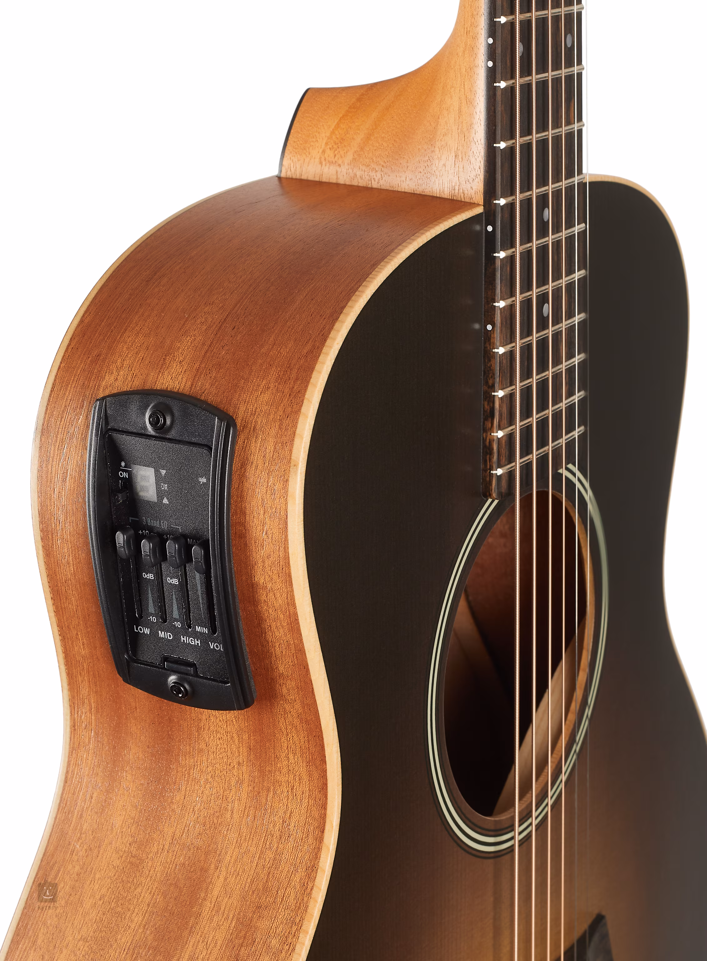 Přední deska elektroakustické kytary GS Mini-e Carbon Burst Special Edition z limitované řady značky je zhotovena ze smrku Sitka, zadní deska a luby jsou vyrobeny z vrstveného sapele. K mahagonovému krku je přilepen ebenový hmatník osazený dvaceti pražci. Stabilitu ladění zaručuje uchycení strun přes nultý pražec z materiálu NuBone v ebenové kobylce a chromovaných die-cast mechanikách Taylor.