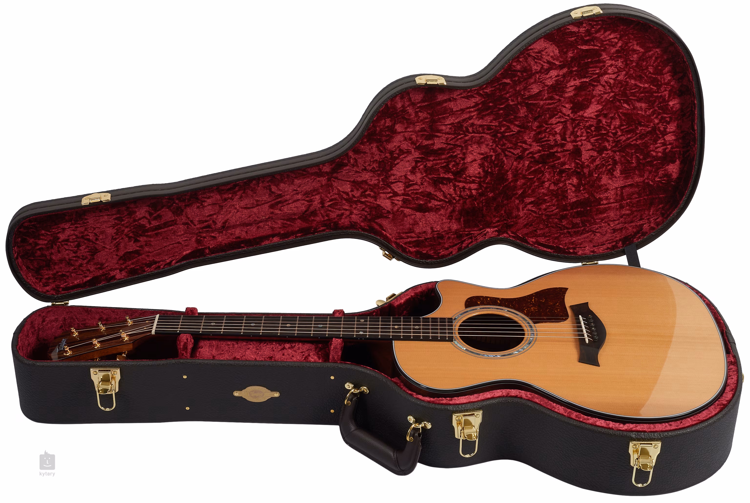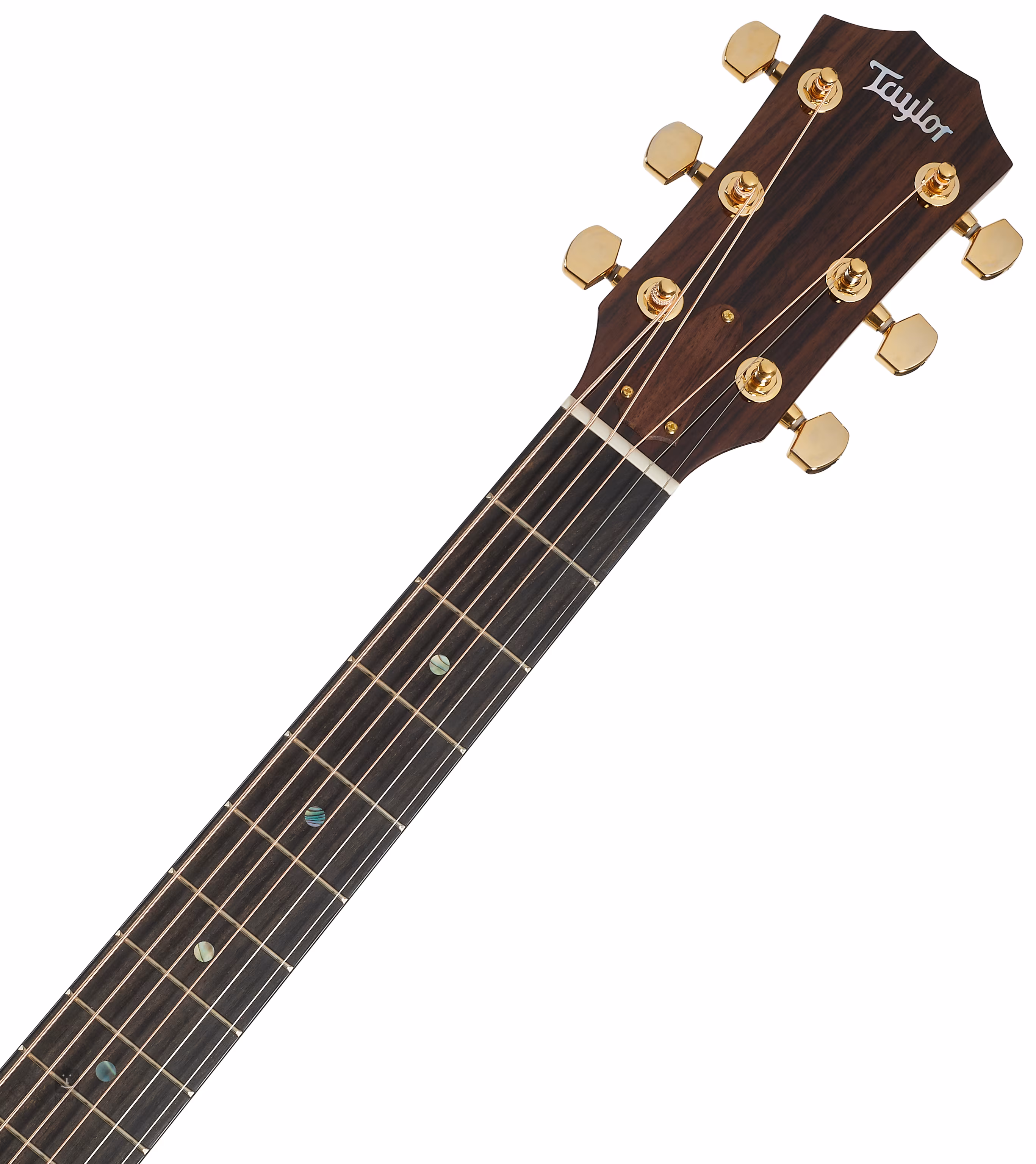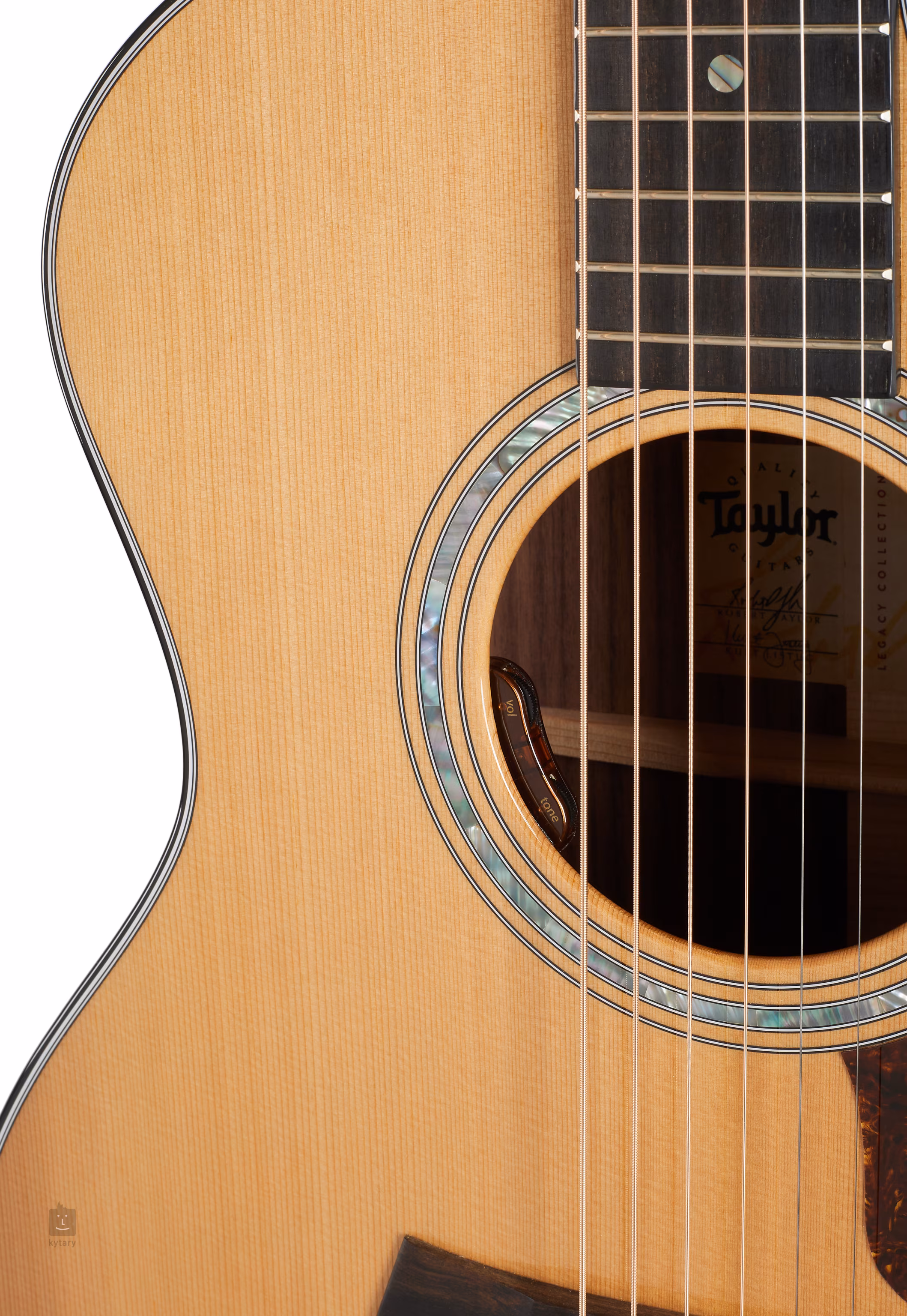 Struny jsou uchyceny ve firemních mechanikách ve zlatém provedení a v ebenové kobylce v moderním Taylor tvaru. Pěkné zpracování podtrhuje černá obvodová lemovka, rozeta ze zeleného abalonu, ebenové kolíčky do kobylky s perleťovými tečkami (Abalone) a pickguard z imitace želvoviny.