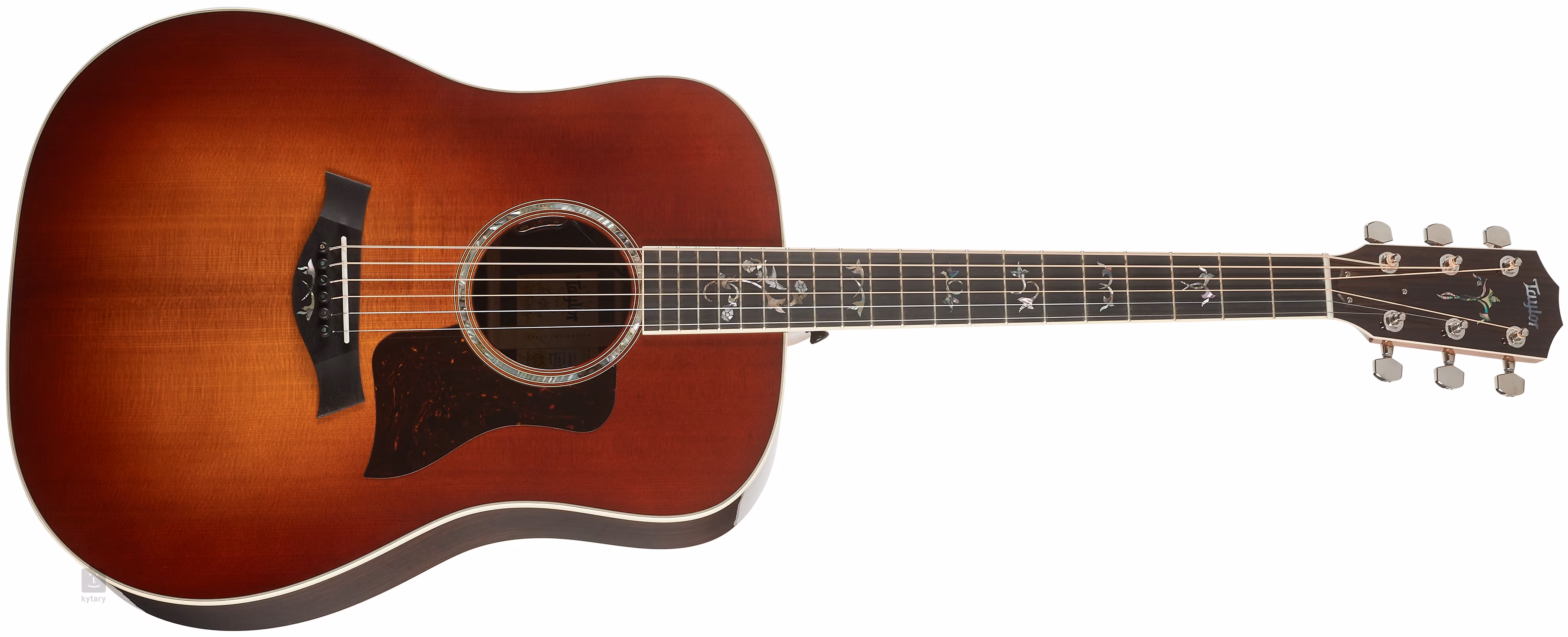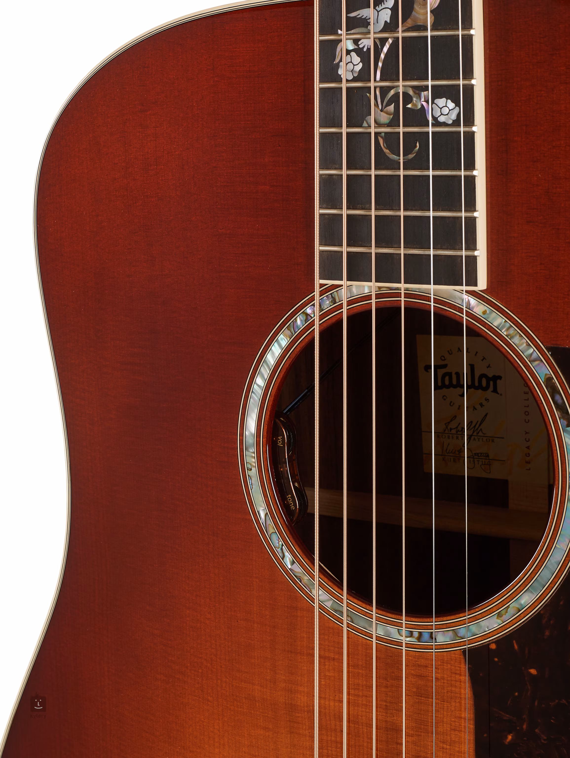 Struny jsou uchyceny v niklových firemních mechanikách a ebenové kobylce. Luxusní zpracování podtrhují dekorativní perleťové “cindy” inlaye na hmatníku (Mother-of-Pearl, Abalone), Heritage Burst finiš v třešňově červené barvě, krémová obvodová lemovka, rozeta ze zeleného abalonu, ebenové kolíčky do kobylky s perleťovými tečkami (Abalone) a pickguard z imitace želvoviny.