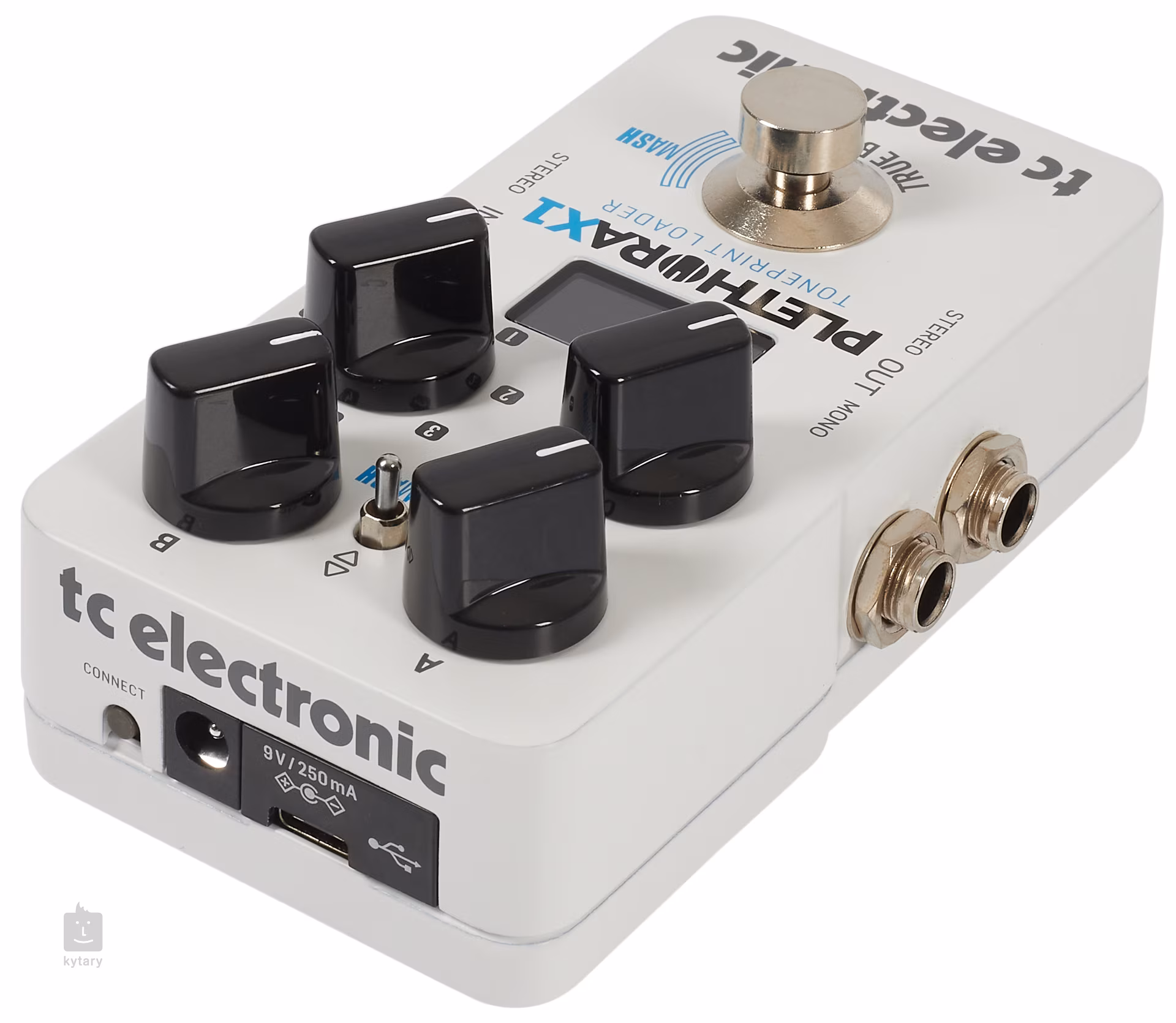 Krabička podporuje stereo připojení a obsahuje USB-C konektor pro propojení s počítačem nebo mobilním zařízením. PLETHORA X1 nabízí přepínatelný bypass, takže můžete volit mezi true a buffered bypass. K napájení slouží 9V adaptér.