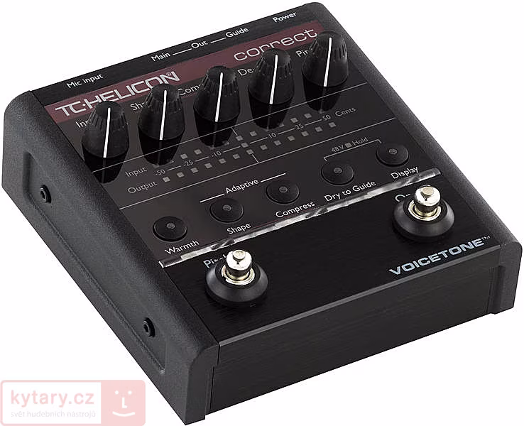 Pokud jde o samotný efekt, tak na jeho horní straně naleznete 5 potenciometrů, 5 tlačítek a dva nožní spínače, krom toho i signalizační LED diody. Zcela nahoře je nejprve ovladač Input nastavující zisk na vstupu mikrofonního preampu, dále Shape ovlivňující ekvalizaci tónu a Compress pro určení míry komprese. Nakonec jsou zde ovladače De-Ess a Pitch, pomocí kterých lze pracovat se sykavkami a nastavit míru korekce neladících tónů.