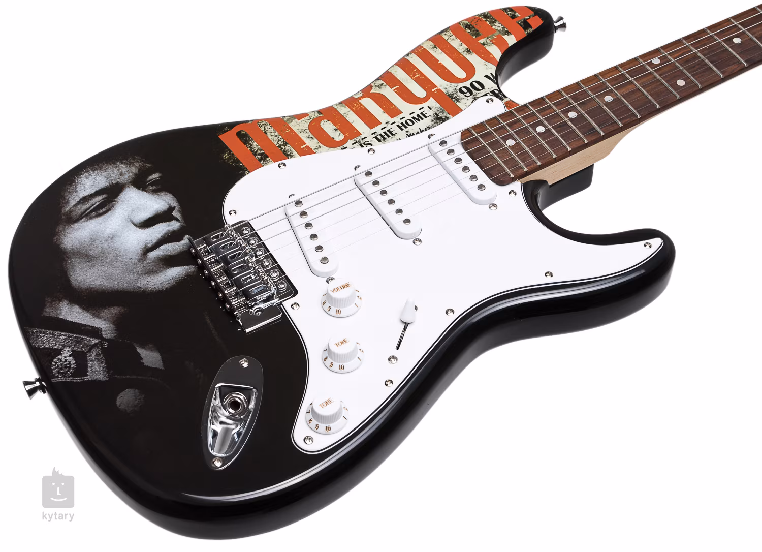Tato elektrická kytara typu Stratocaster je vhodná jako první nástroj pro začínající hráče. Na šroubovaném javorovém krku nástroje se nalézá palisandrový hmatník osazený 22 pražci. Začínající hráči především ocení bílé značky usnadňující orientaci při hře.