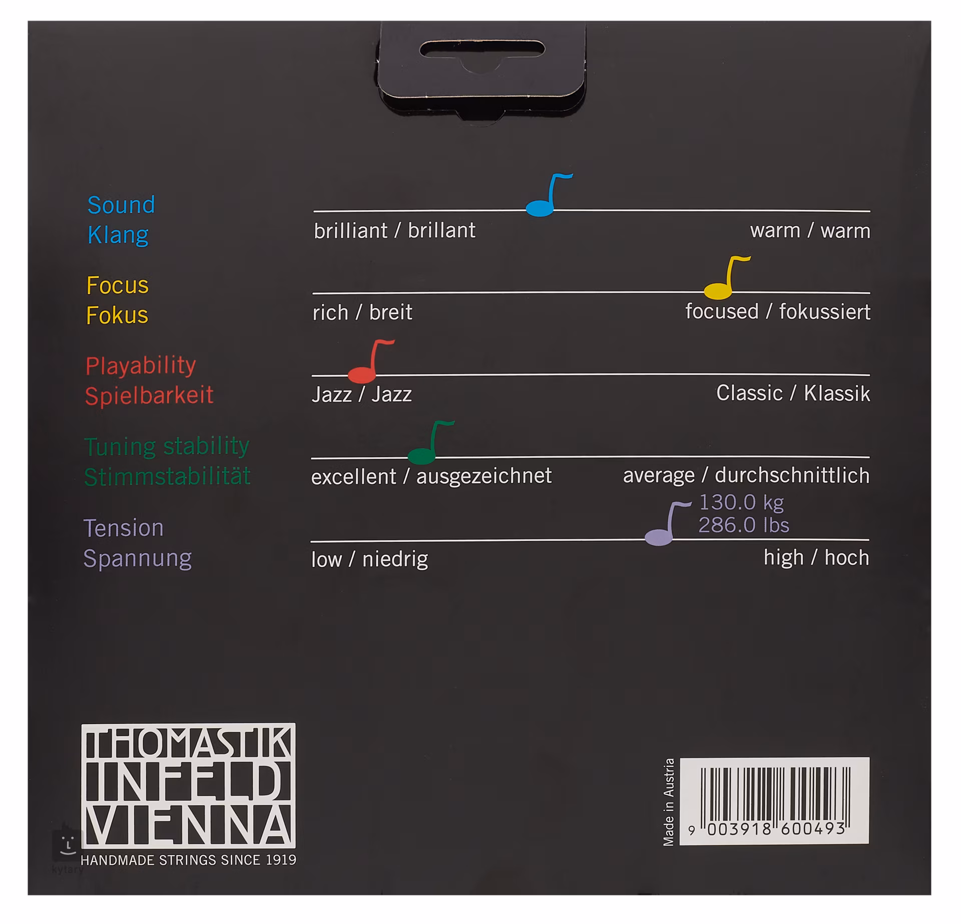 Struny ze série Spirocore nabízí hudebníkům zcela unikátní zvuk ve špičkové kvalitě, jak jsme u společnosti Thomastik zvyklí. Použití spirálovitého jádra dodává strunám mnohem delší životnost, skvěle reagují na dynamiku hry a zároveň mají neuvěřitelný sustain. Zvuk je typicky ostrý a průrazný, je proto velmi oblíbený u hráčů lidové hudby. Vidět je však můžete i na nástrojích hráčů klasiky. Hodí se jak pro hraní smyčcem, tak pro pizzicato.