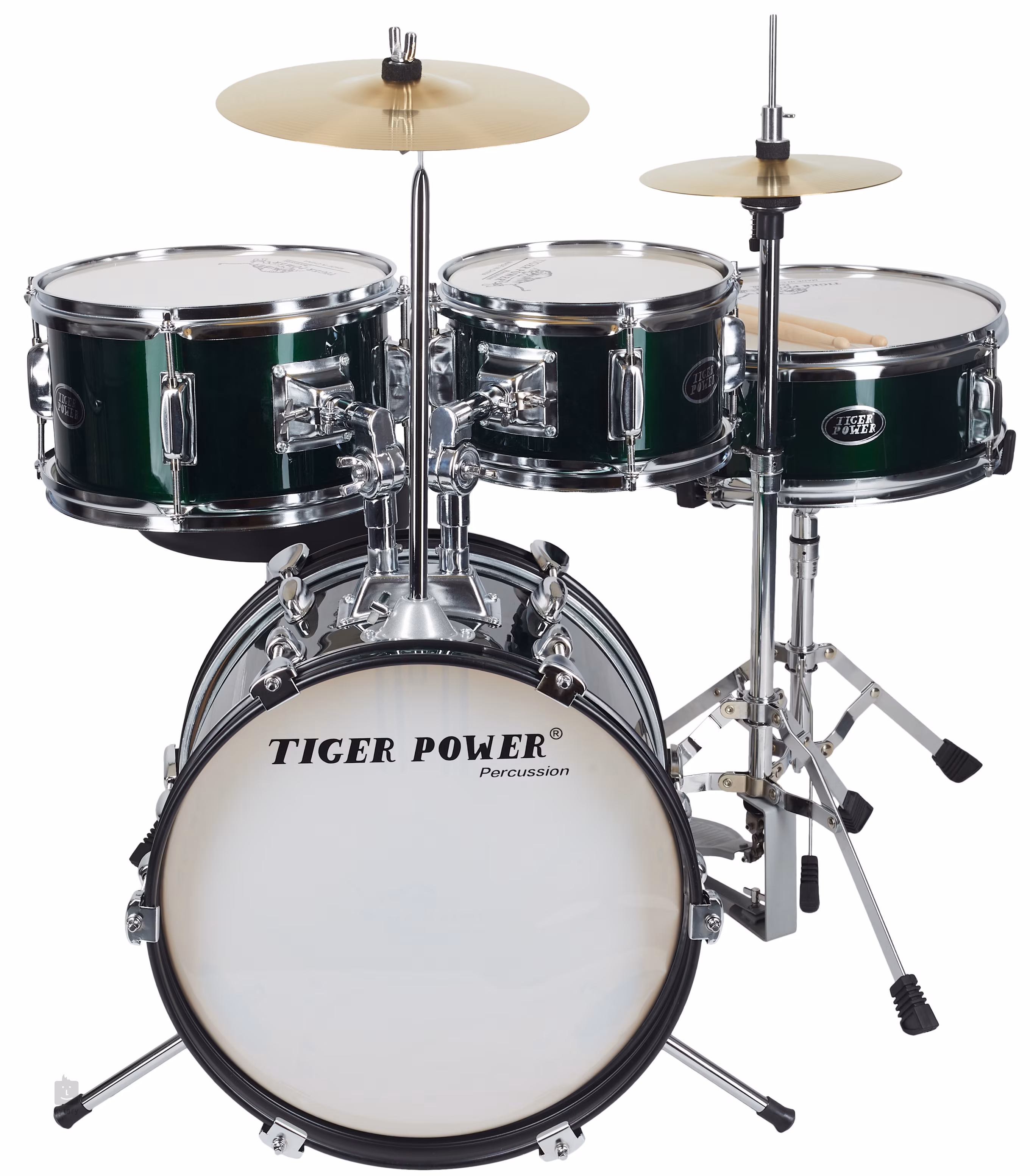 Dětská bicí souprava Tiger Power TCCJR40 v barvě Dark Green je ideální volbou pro mladší hráče a začátečníky, kteří chtějí proniknout do světa bubnování. Tato cenově dostupná sada nabízí vše, co začínající bubeník potřebuje – basový buben s pedálem, dva tomy, snare a 8" crash činel, stejně jako hi-hat činel se stojanem. Souprava obsahuje také stojany pro upevnění jednotlivých bubnů, pohodlnou bubenickou stoličku, pár paliček a ladič.