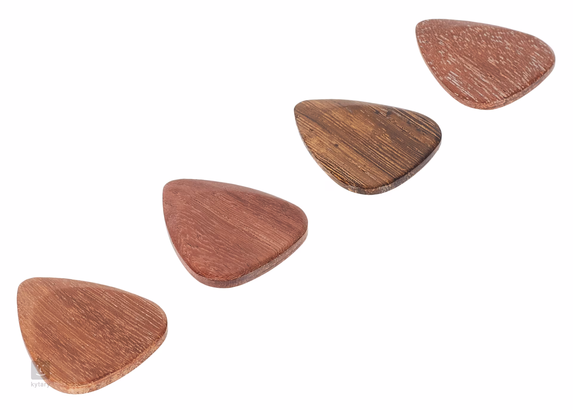 V balení najdete trsátka z těchto dřevin: Almondwood je velmi měkká a zvukově vřelá dřevina, Thai Cassia a Burma Padauk jsou oproti ní tvrdší a produkují spíše vyvážený, frekvenčně neutrální tón. Nejtvrdší dřevinou z balení je Mimosa, která dodá vaší kytaře průraznost a zvýrazní její výšky.