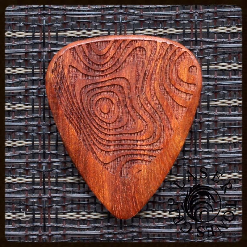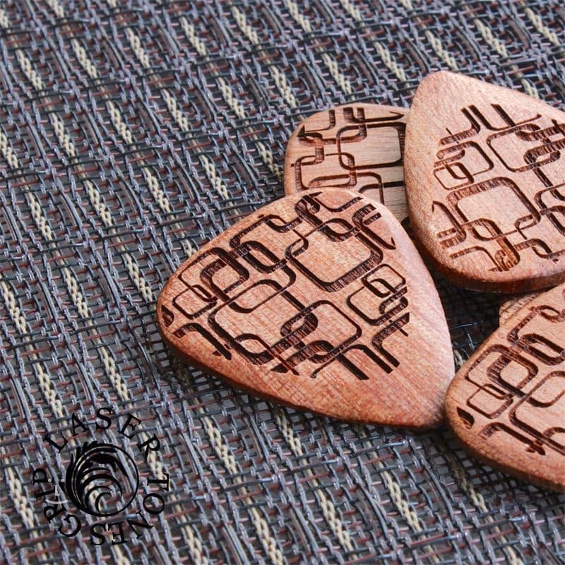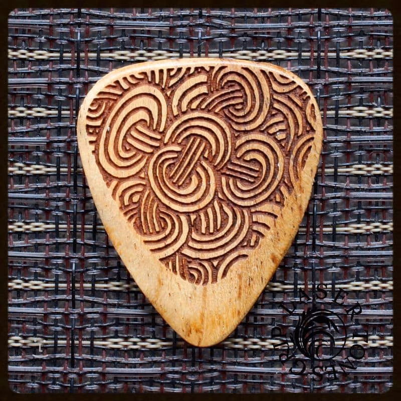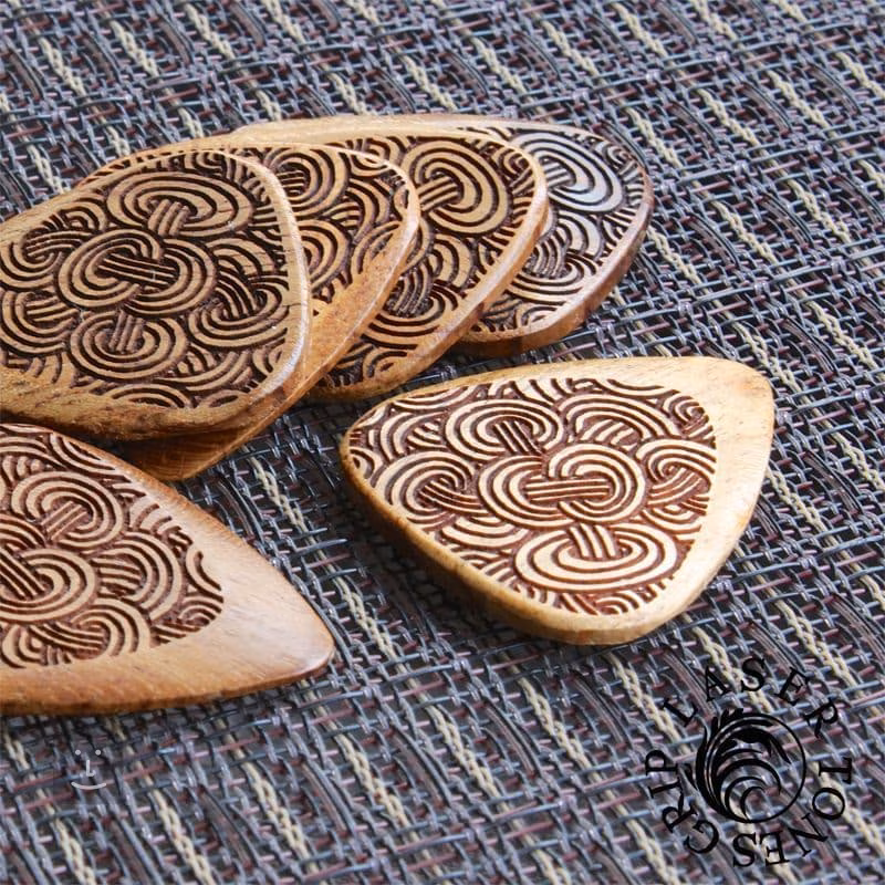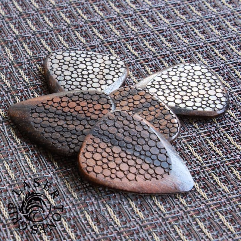 Dvě trsátka z tvrdých dřevin – Bloodwood a Makassarský eben – produkují průrazný a jasný zvuk, vhodný zejména pro elektrické kytary. Zbylá dvě trsátka jsou naopak z měkčích dřevin – Almondwood a Thai Sindora – a jejich zvuk je vřelý a kulatý, ideální pro hru na akustickou kytaru. Trsátka mají tloušťku 2,5 mm, která se směrem ke špičce zužuje na 0,7 mm. Laserem vyřezaný motiv jim dodává nejen stylový design, ale také pevný, protiskluzový grip.