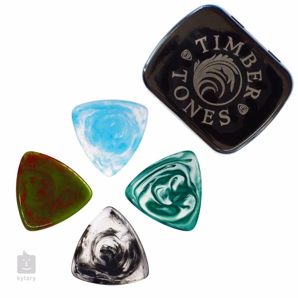 Ať už hledáte dárek pro nadšeného kytaristu nebo se jen pídíte po dokonalém zvuku a toužíte vyzkoušet trsátka z netradičních materiálů, u Timber Tones zajisté najdete, co potřebujete. Trsátka ze série Resin Tones jsou vyrobena z té nejkvalitnější přírodní pryskyřice, která je středně tvrdá, velmi odolná a zvuku kytary dodává vřelý a zakulacený tón. Trsátka jsou v místě úchopu 2,5 mm tlustá, směrem ke hrotu se zužují na 0,7 mm. Jejich design je inspirován čtyřmi klasickými rockovými hity – Smoke on the Water, Life on Mars, Moondance a Mr. Blue Sky.