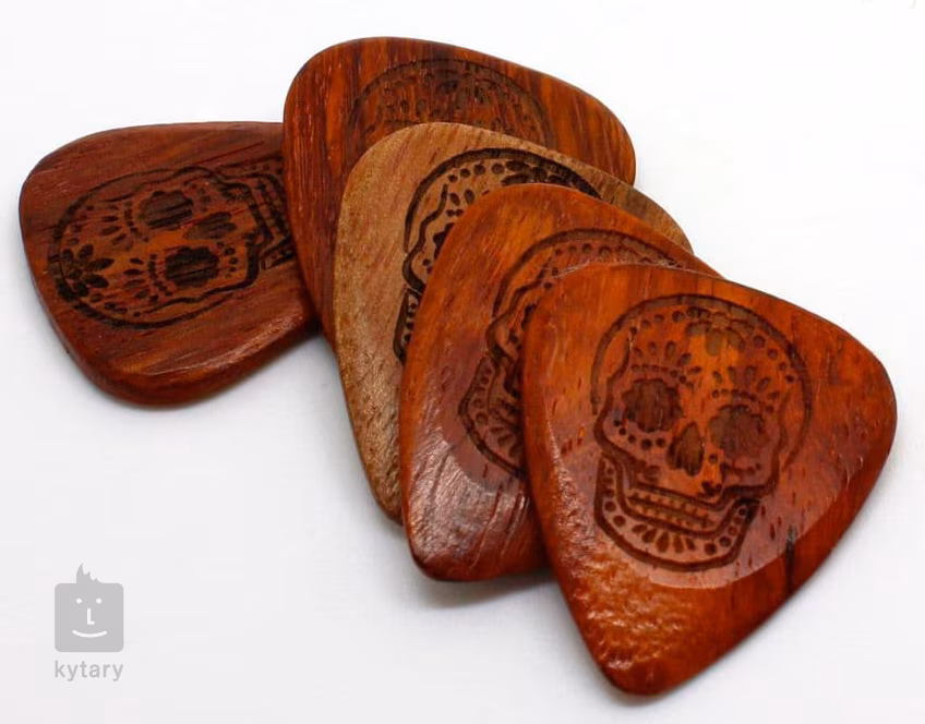 Ať už hledáte dárek pro hudebního nadšence nebo se jen pídíte po dokonalém zvuku a toužíte vyzkoušet trsátka z netradičních materiálů, u Timber Tones zajisté najdete, co potřebujete. Dřevěná trsátka ze série Tattoo Tones jsou vyrobena z různých exotických dřev. Africký eben, Bloodwood a Lignum Vitae jsou výjimečně tvrdé dřeviny, které při úderu do strun produkují čistý a úderný zvuk, zatímco o něco měkčí dřevo jírovce indického vytváří poněkud vřelejší a kulatější tón. Trsátka mají tloušťku 2,5 mm, která se směrem ke špičce zužuje na 0,7 mm. Laserem vyřezaný motiv jim dodává nejen stylový design, ale také pevný protiskluzový grip.