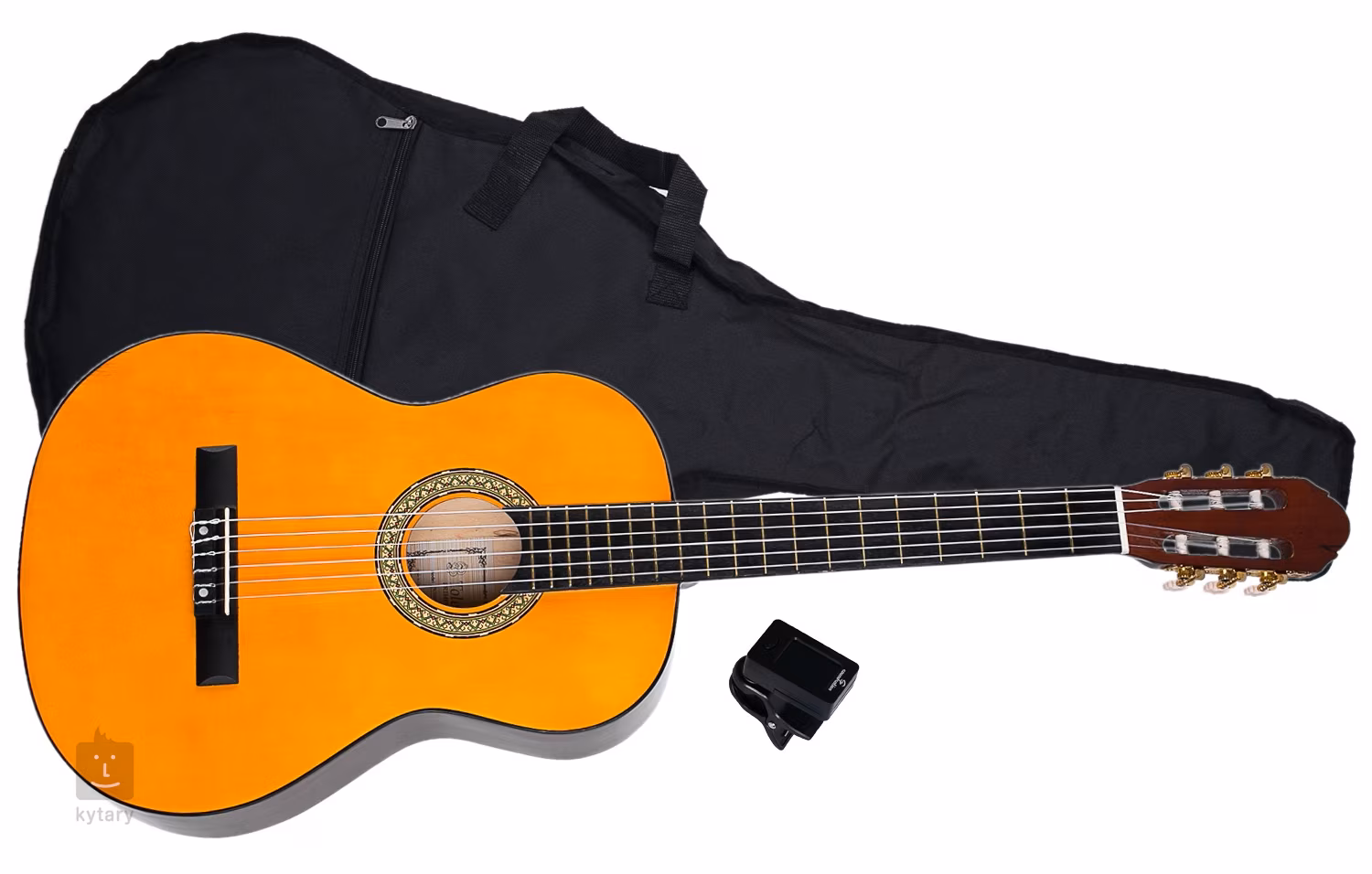 Cenově dostupná kytarová sada pro začínající hudebníky obsahuje vše, co budete během vašich prvních krůčků potřebovat. V balení najdete klasickou kytaru velikosti 4/4 osazenou nylonovými strunami, klipovou ladičku pro snadné a rychlé naladění a pouzdro s přední kapsou na příslušenství.