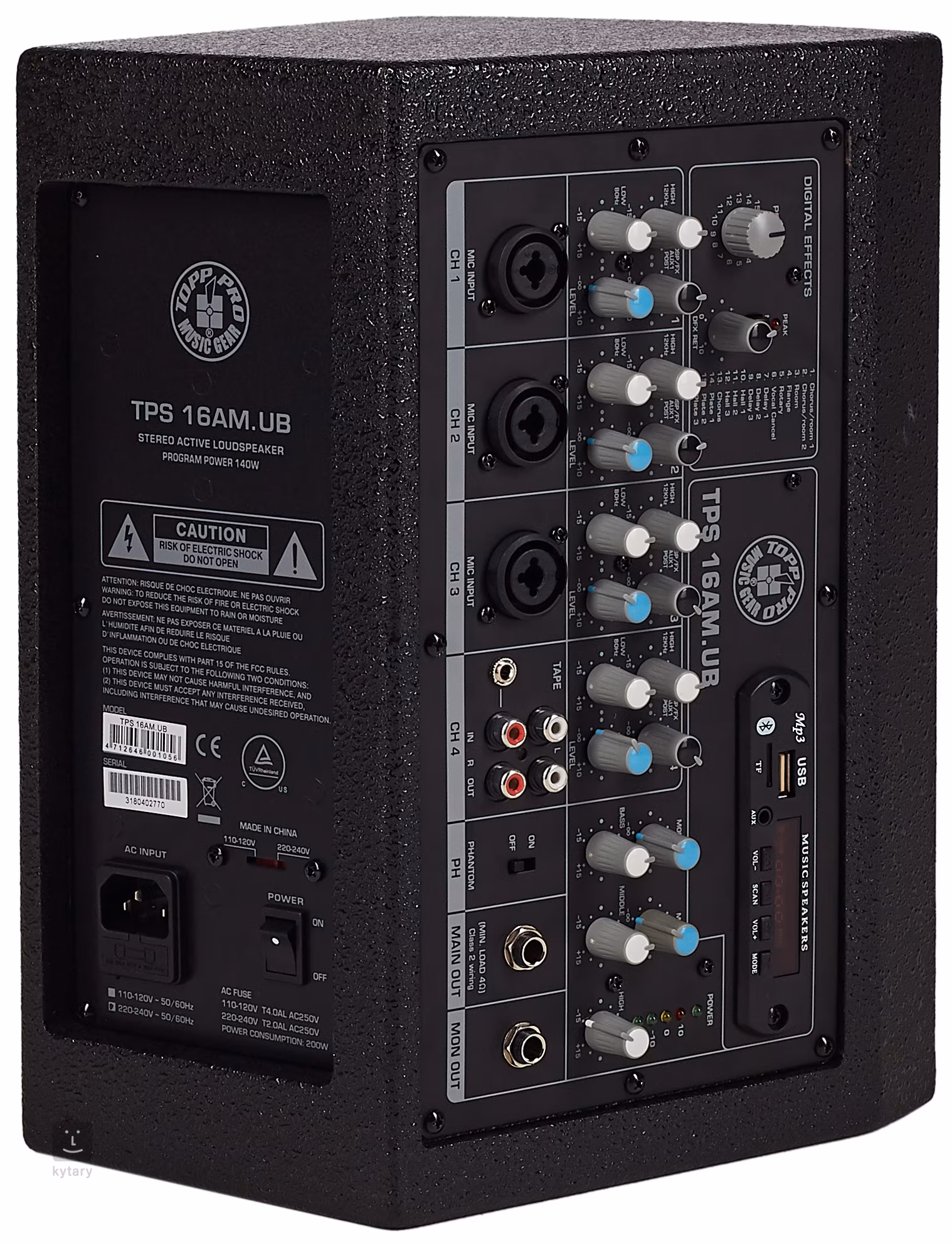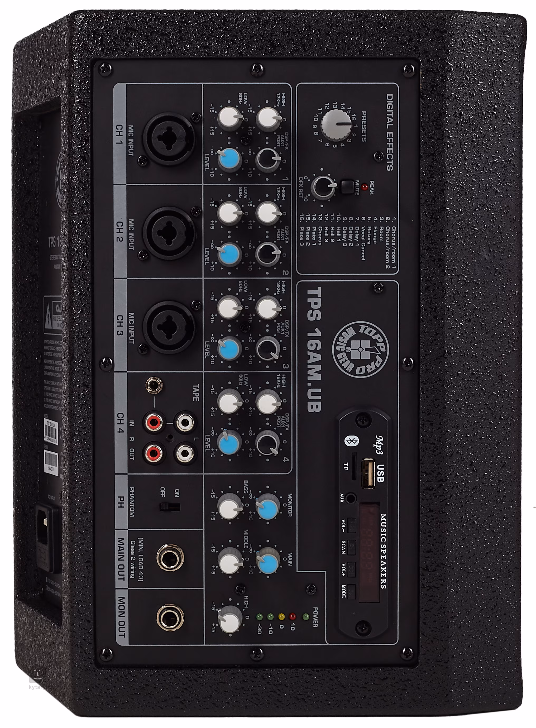 Topp Pro TP TPS16AMUB je kompaktní ozvučovací systém, který v těle reproboxu skrývá mixážní pult s pěti vstupy a multimediálním přehrávačem.