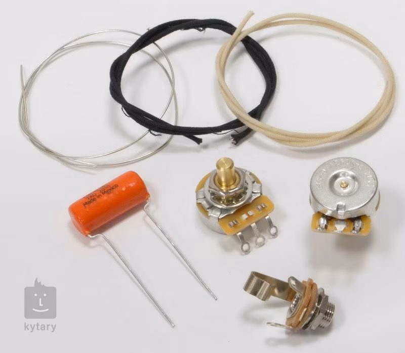 Srdcem sady jsou dva na zakázku vyrobené potenciometry CTS 250k Dimple s vintage audio průběhem (30% log), které zajišťují naprosto čistý a jasný tón bez ztráty výšek, i když stáhnete ovladač hlasitosti. Není tak potřeba žádný další „treble bleed“ obvod. O tónovou clonu se stará legendární kondenzátor Sprague Orange Drop (0.047µF), který při stažení příjemně zdůrazní středy a podpoří charakteristický „vrčivý“ zvuk nástroje. Spolehlivé připojení garantuje výstupní jack od americké firmy Switchcraft a celou sestavu propojíte pomocí autentického, textilem opleteného push-back drátu, který usnadňuje pájení a dodává instalaci dobový vzhled.