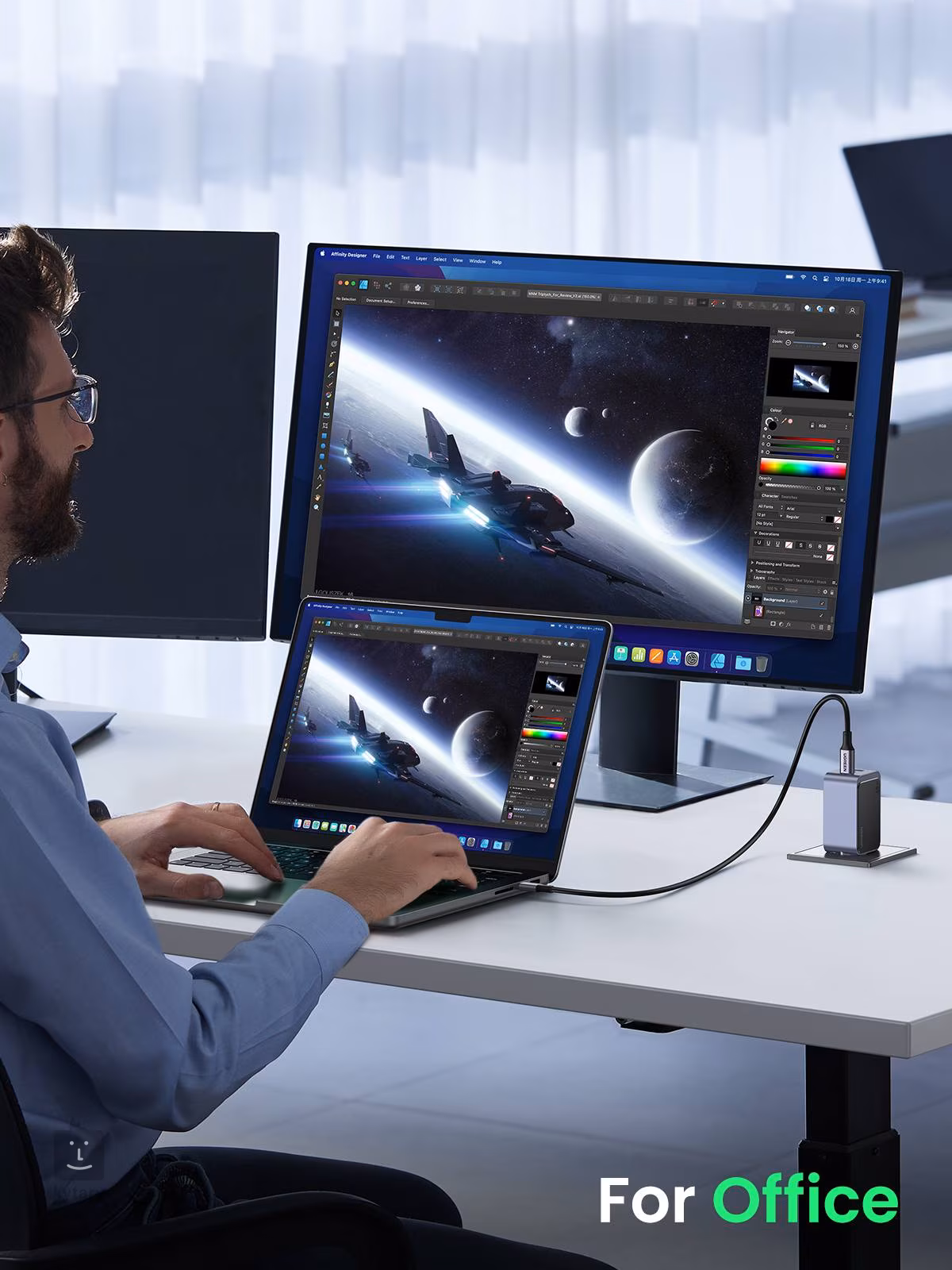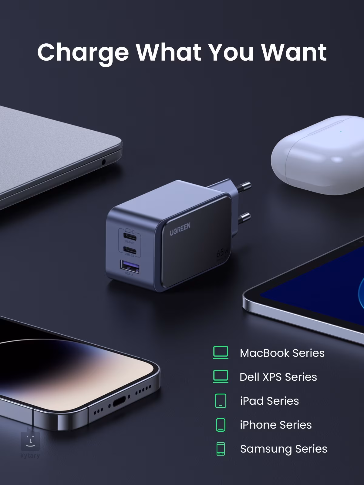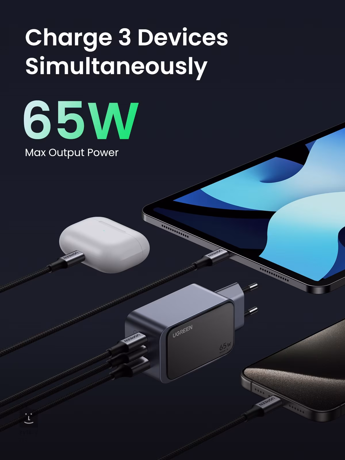 Zapomeňte na pomalé nabíjení. S výkonem 65 W dokáže tato nabíječka vašemu MacBook Air dodat 50% kapacity během 90 minut, zatímco zároveň nabíjí váš telefon či sluchátka, a to vše bez kompromisů a najednou. Díky dvěma USB-C portům a jednomu USB-A můžete nabíjet až tři zařízení současně.