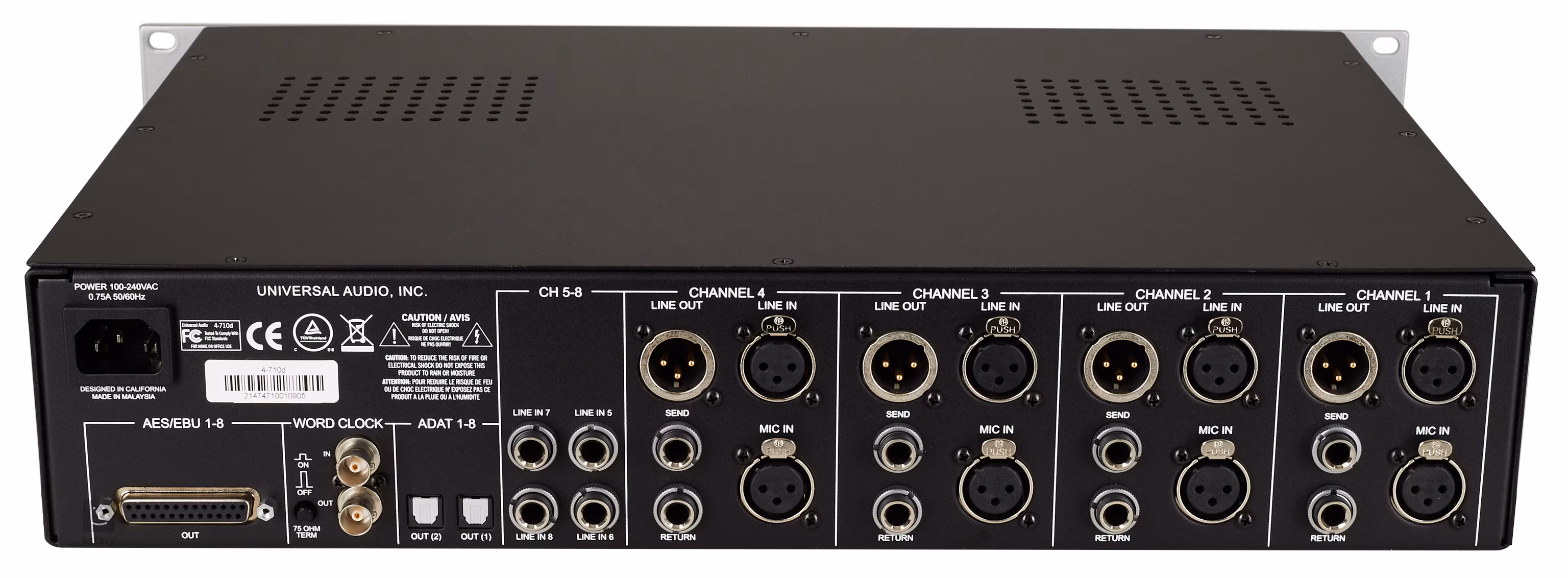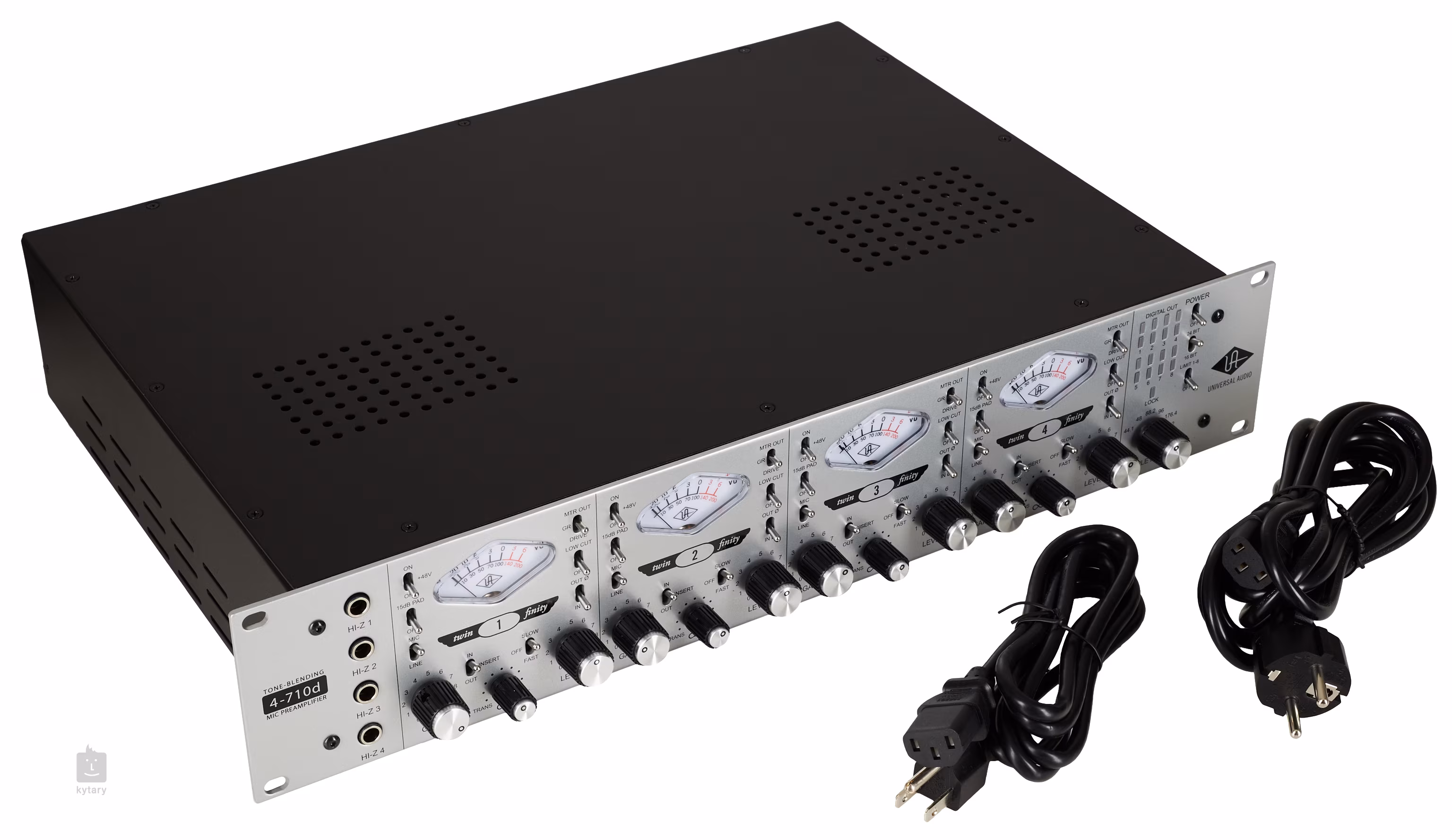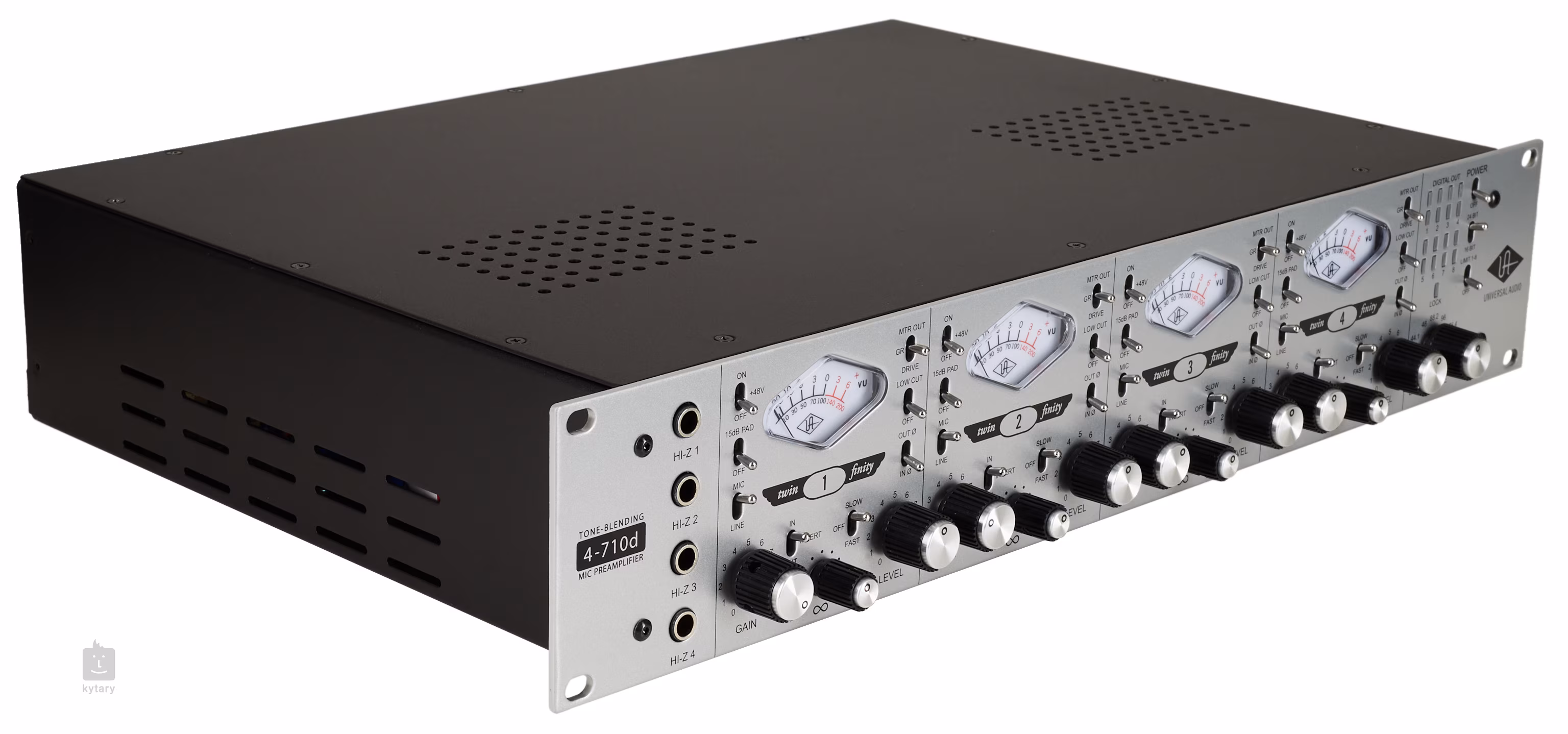 Universal Audio 4-710d je jedním z nejflexibilnějších mikrofonních preampů na trhu vůbec. Nabízí čtyři předzesilovače Twin-Finity s plynulým nastavením mezi tranzistorovým nebo lampovým zvukem, kompresi typu 1176 na každém kanálu (fast/slow) a kromě analogových, také digitální výstupy v podobě AES/EBU, ADAT a Word Clock, takže není problém ho integrovat do jakéhokoliv studiového systému.