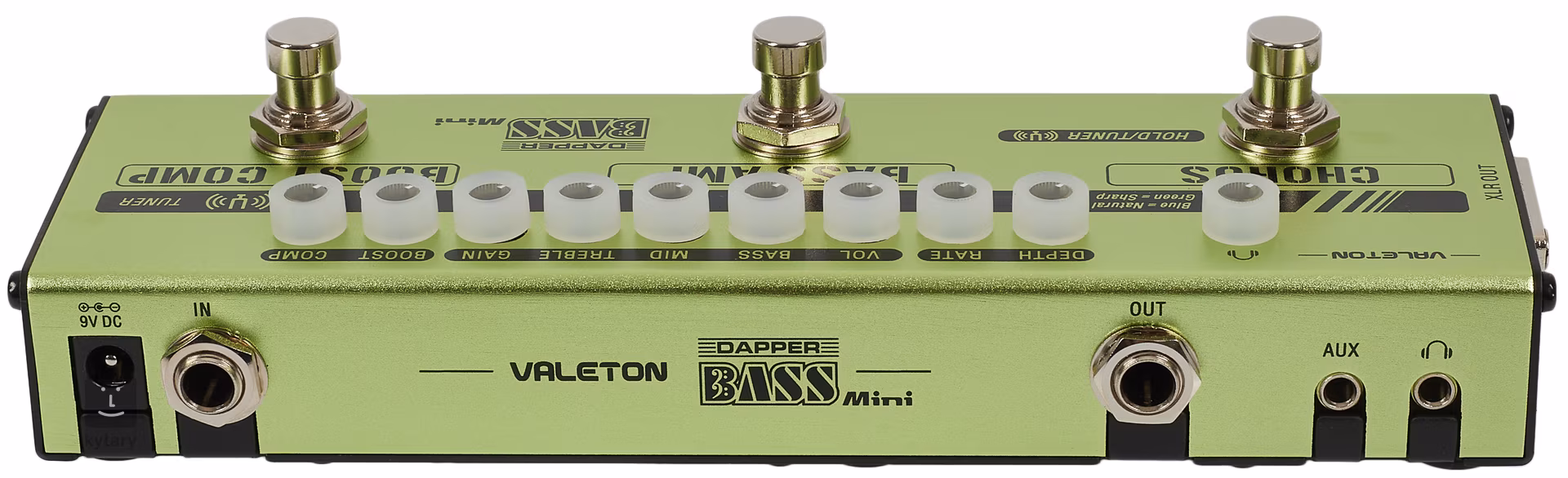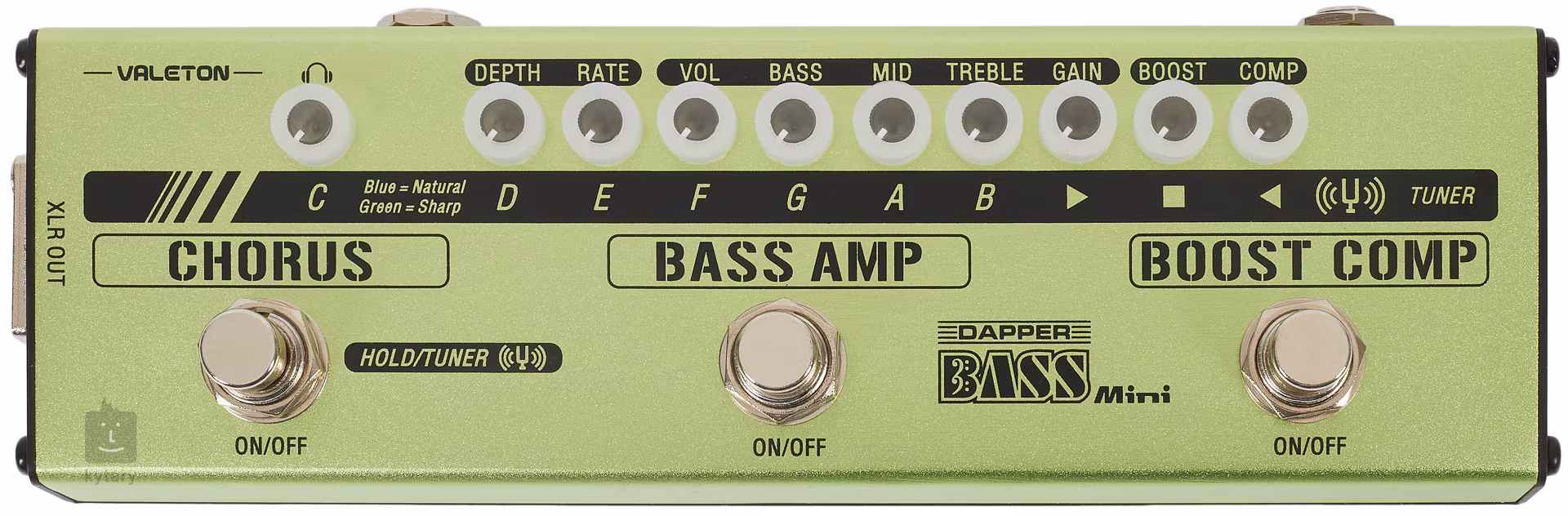 Baskytarový multiefekt Dapper Bass Mini od společnosti Valeton je kompaktní, ale velmi výkonný nástroj, který obsahuje všechny nezbytnosti pro basové hráče, kteří hledají širokou paletu efektů v jednom přístroji. Začíná tunerem, který je rychlý, přesný a umožňuje hrát vždy dokonale vyladěně. Následuje kombinovaný efekt BOOST COMP, který spojuje funkce boostu a kompresoru, což dává hráči možnost okamžitě vylepšit zvuk s jednoduchým ovládáním.