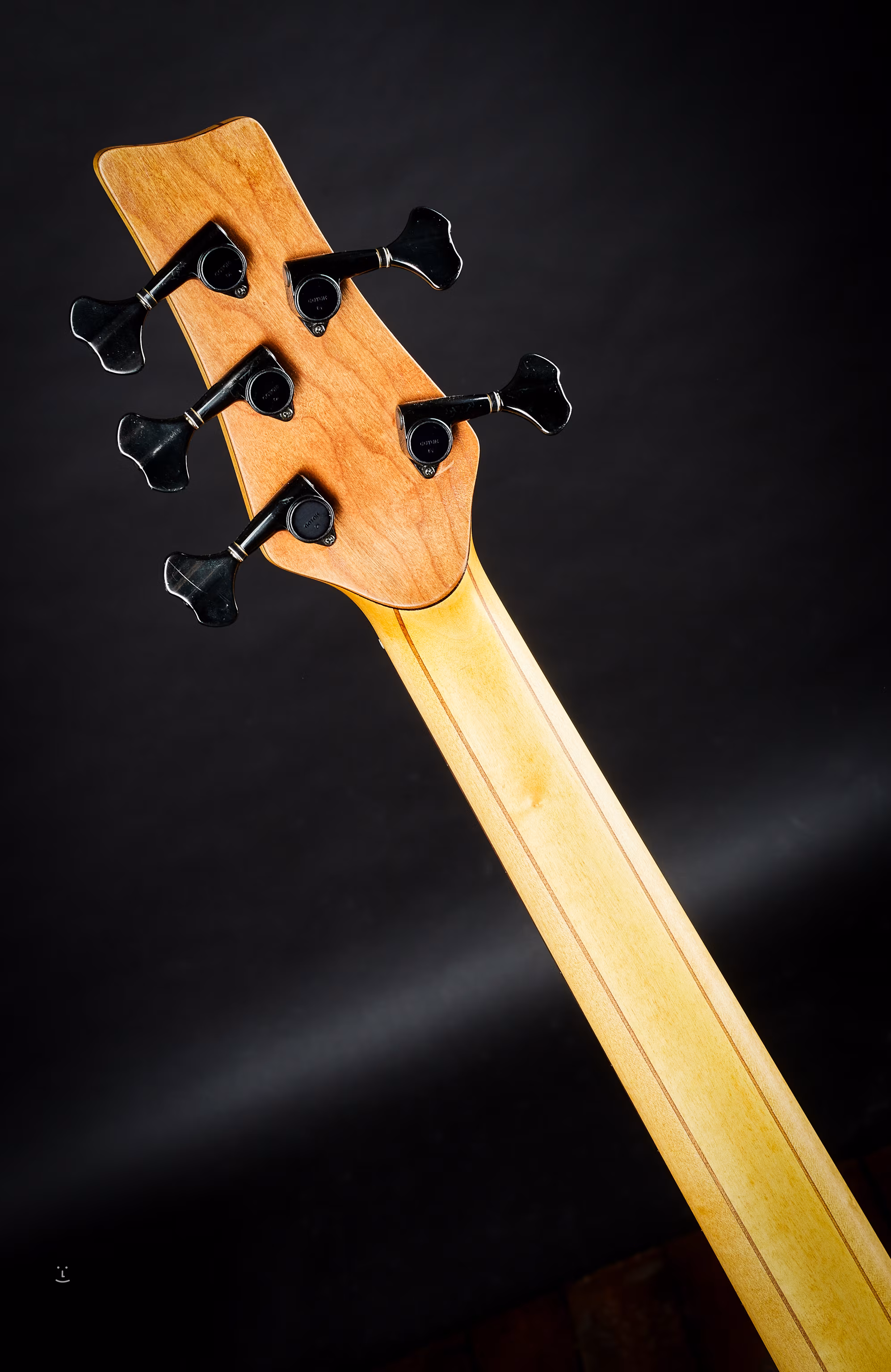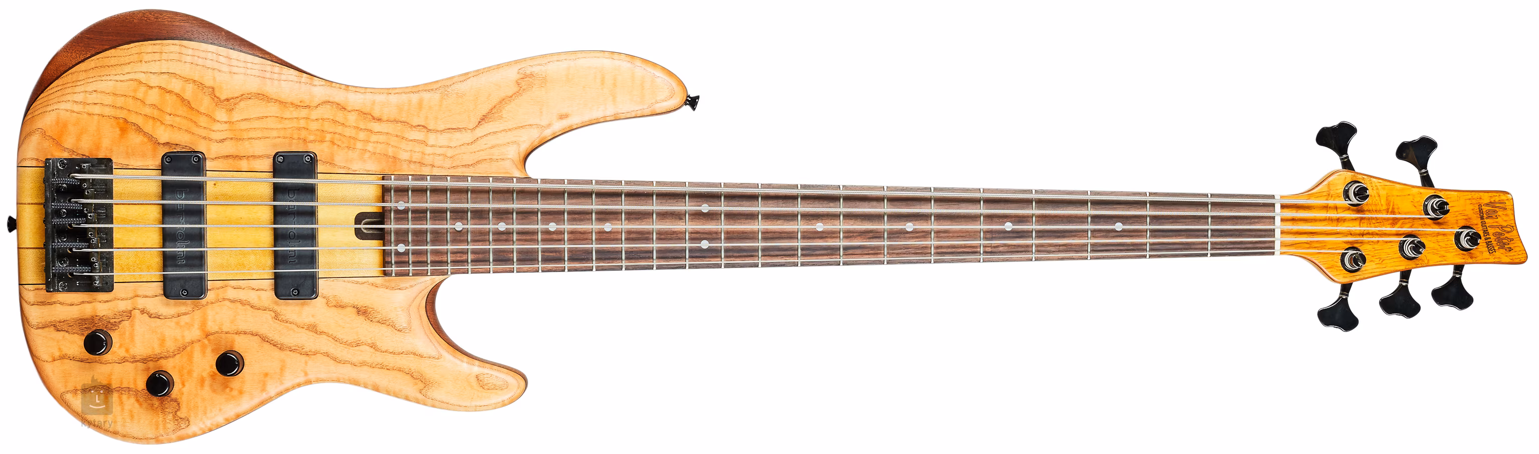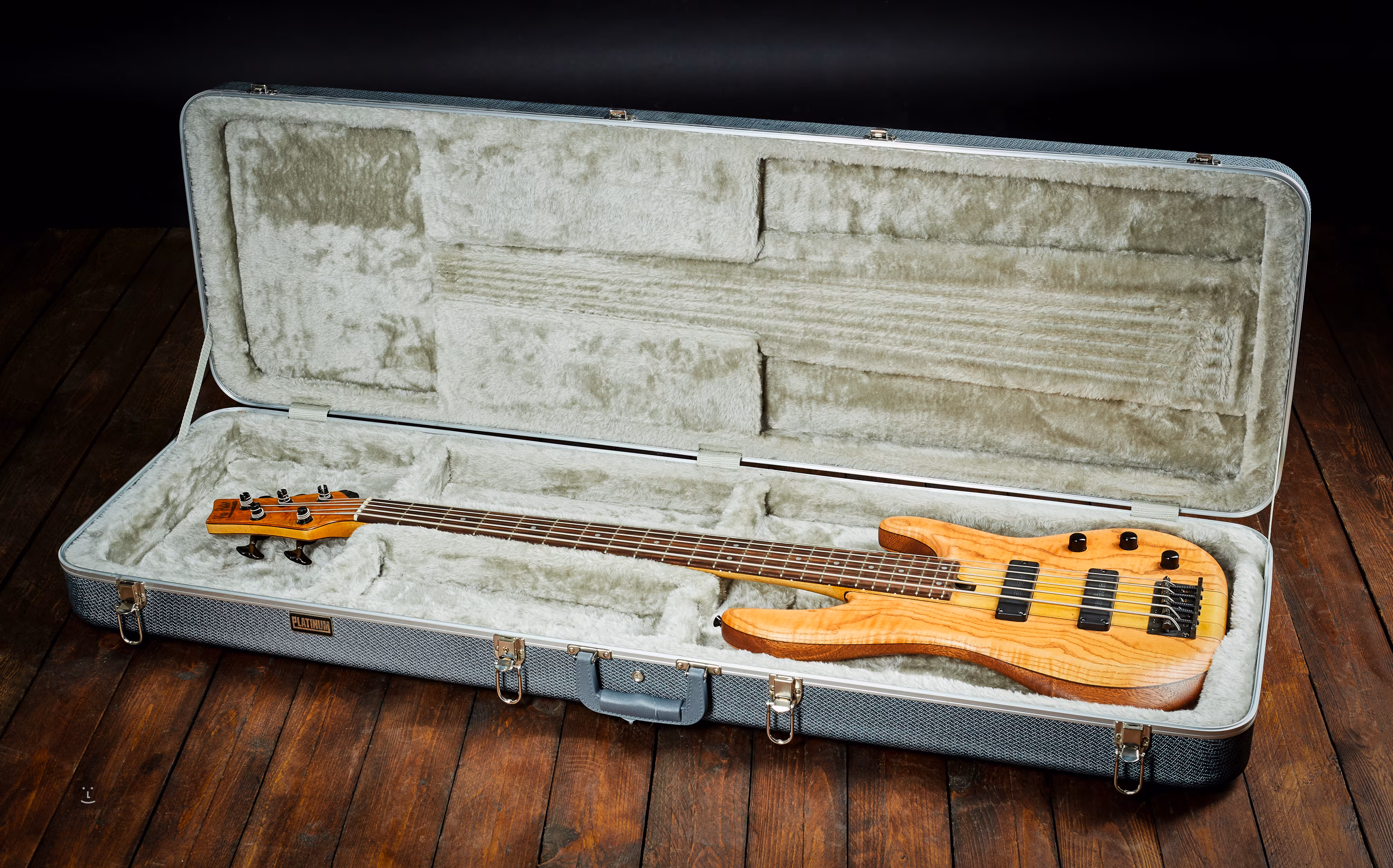 Pětistrunná baskytara s jasanovo-mahagonovým tělem a třívrstvým javorovým krkem (s proložkami z tmavého dřeva).
