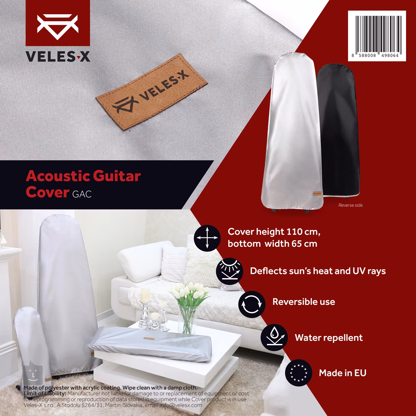 Oboustranný protiprachový kryt vhodný pro akustické kytary. Stříbrná strana najde využití hlavně při live performance, jelikož zabraňuje přehřátí nástroje a odráží UV záření, čímž prodlužuje udržitelnost původní barvy. Strana s černým povrchem potom slouží jako protiprachový obal pro domácí a studiové použití. Kryt dále disponuje voděodolným povrchem a gumičkou pro stažení.