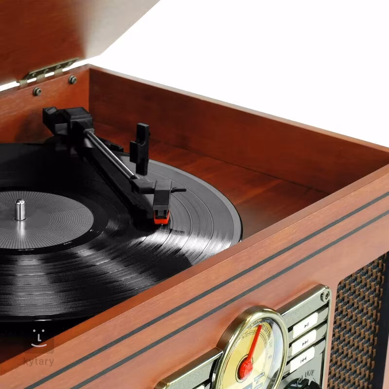 Gramofon Victrola Quincy přináší fragmenty elegantního designu z poloviny 20. století do hudebního centra typu all in one. Nádhernému retro provedení vévodí velké ovládací prvky v čele s kruhovou základnou pro ladění FM rádia.