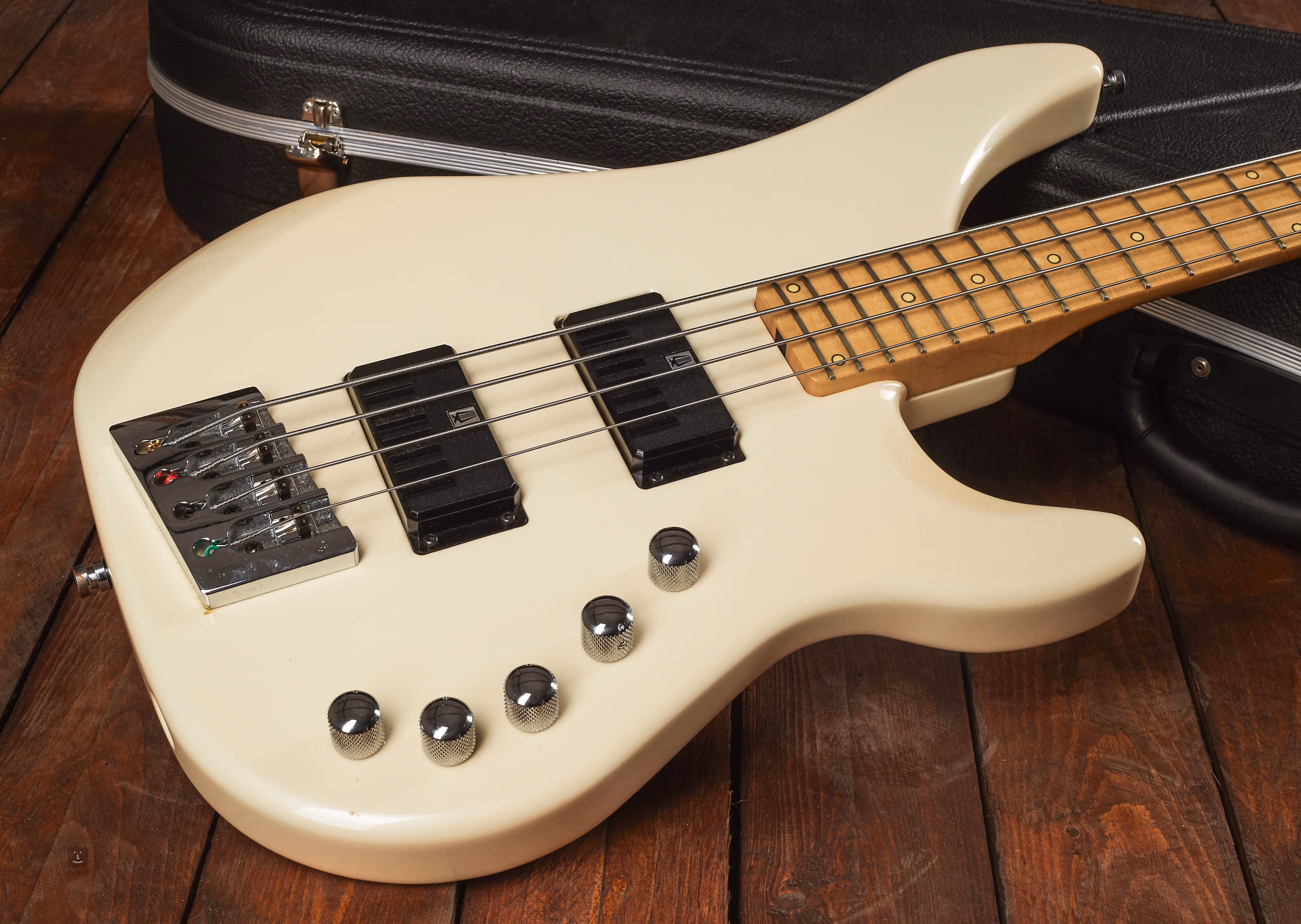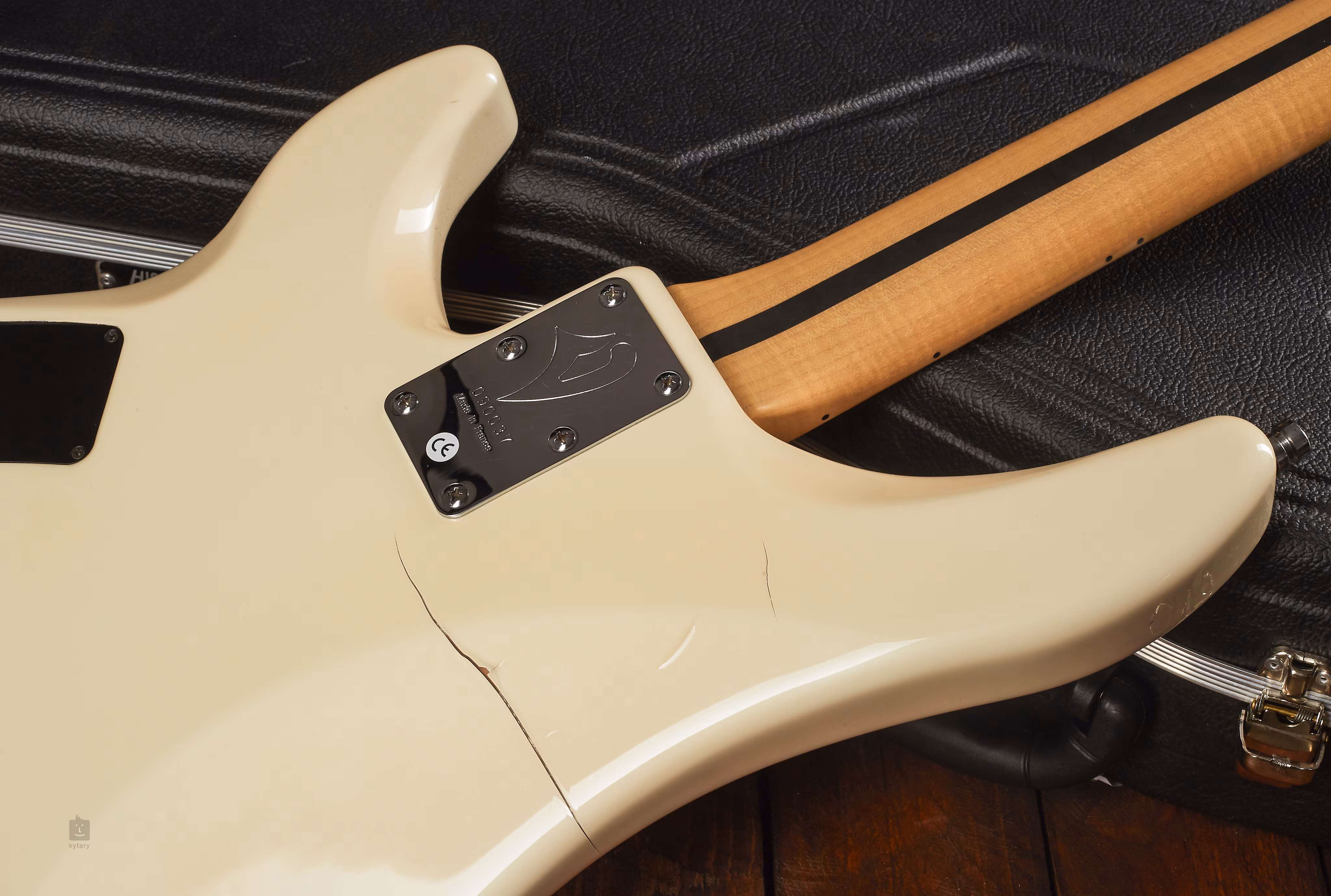 Nástroj je v perfektním stavu, kromě kosmetické praskliny na zadní straně těla (vzi fotografie). Vše je 100% funkční, na baskytaře naleznete velmi málo známek po předchozím používání. Nástroj se dodává v luxusním kufru (Hiscox) s originálním logem Vigier.