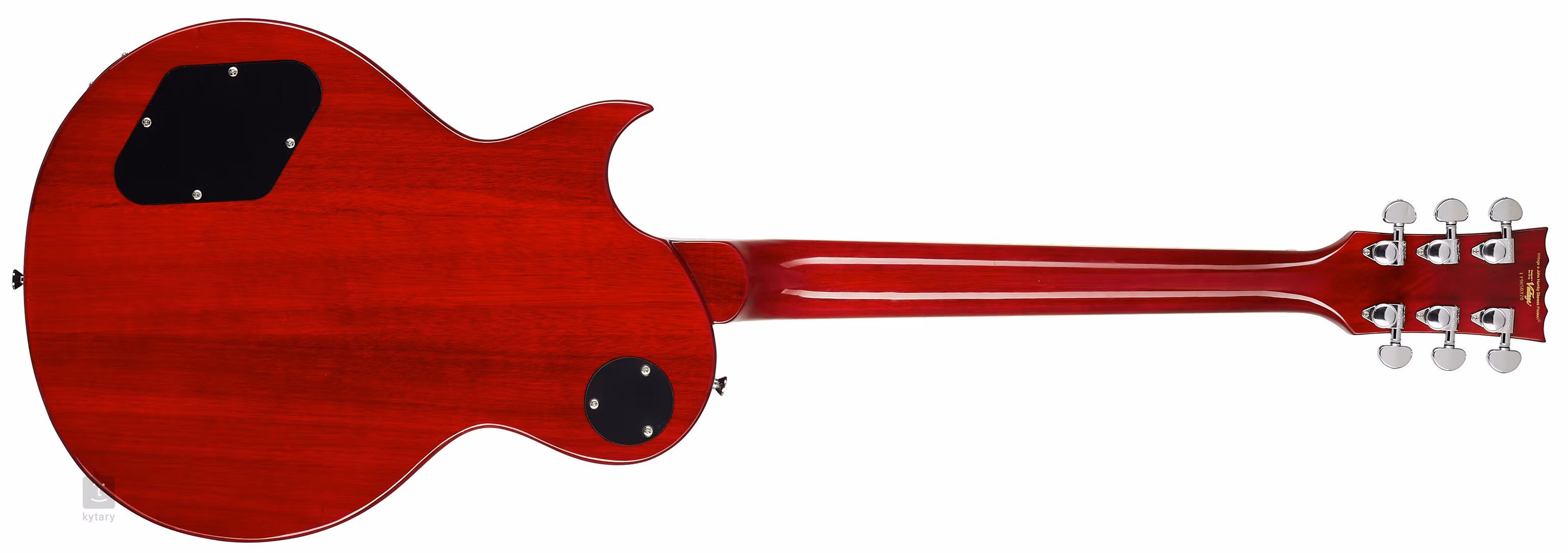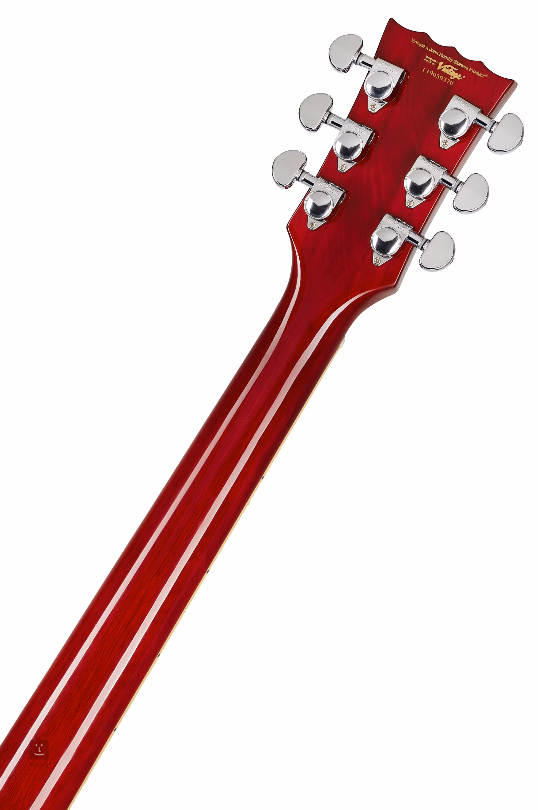 Vintage V1003CSB je stylová elektrická kytara v LP single-cut designu z řady Vintage Reissued Series. Podobně jako některé Custom/Supreme modely slavné americké značky je osazena třemi humbuckery, protože jak praví švédský klasik: “More is more”. Mahagonové tělo kytary kryje vyřezaný top z masivu javoru a barevná úprava Cherry Sunburst. K mahagonovému krku s příjemným “soft C” profilem je přilepen palisandrový hmatník osazený dvaadvaceti pražci velikosti Medium Jumbo. Tři humbuckery značky Wilkinson poskytují kytaře pořádně šťavnatý zvuk, který umí být agresivně rockový i vřele bluesový, a zároveň nebývale širokou paletu tónů. Pomocí samostatných ovladačů Volume můžete stahovat hlasitost jednotlivých snímačů, tj. na prostřední pozici, kde jsou aktivní všechny tři humbuckery, lze nakroutit libovolná kombinace snímačů. Nastavení si tak můžete přizpůsobit přesně podle vašich potřeb. Struny jsou uchyceny přes nultý pražec GraphTech Nubone ve spolehlivých ladicích mechanikách značky Grover a v kobylce Wilkinson TOM a struníku. Elektrické kytary firmy Vintage nabízí za velmi atraktivní cenu výborné zpracování i parametry, které byste našli i u mnohem dražších modelů. Jde o skvělou volbu pro začínající hráče, ale díky zvuku a hernímu komfortu je ocení i pokročilí kytaristé.