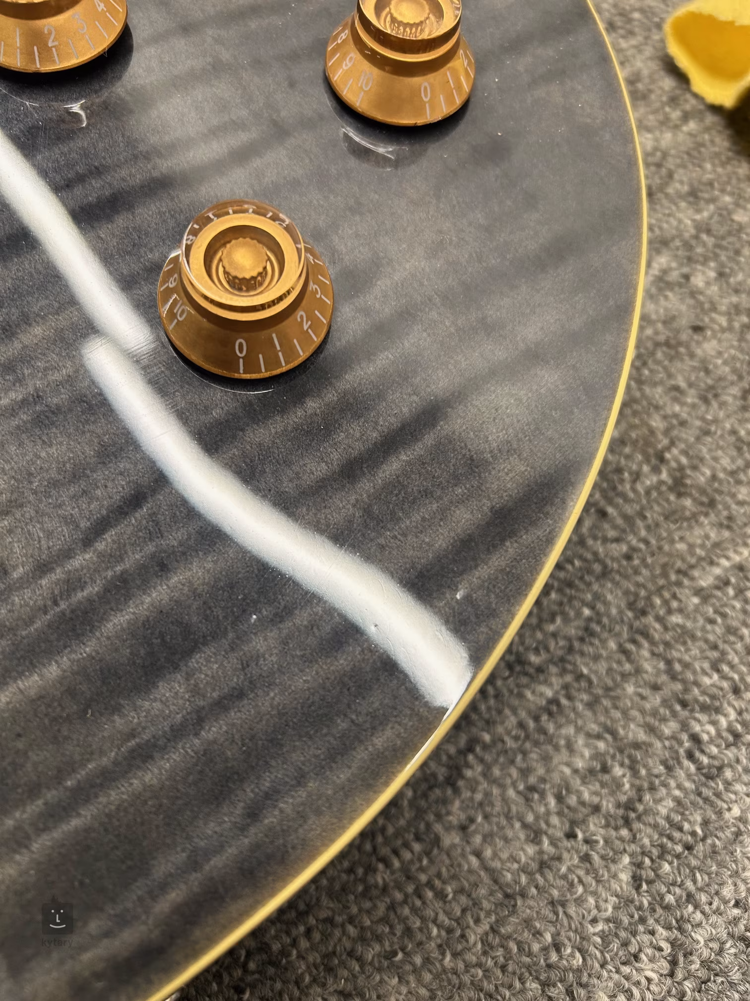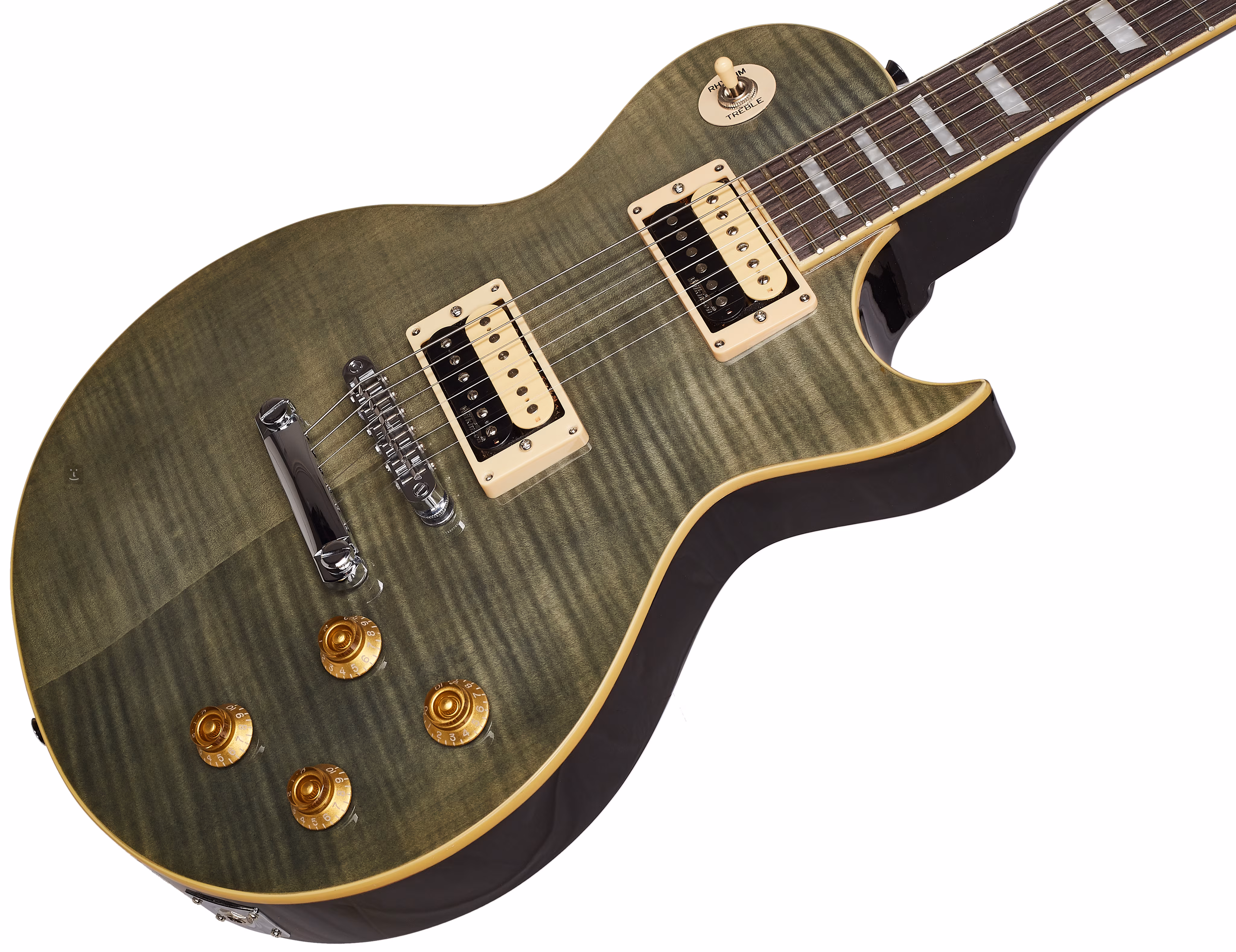Masivní mahagonové tělo nástroje zdobí pěkný top z fládrovaného javoru a působivá barevná úprava Flamed Thru Black. K přilepenému mahagonovému krku přiléhá hmatník z kompozitního dřeva osazený dvaadvaceti pražci. Orientaci po jeho ploše usnadňují perleťové bloky.