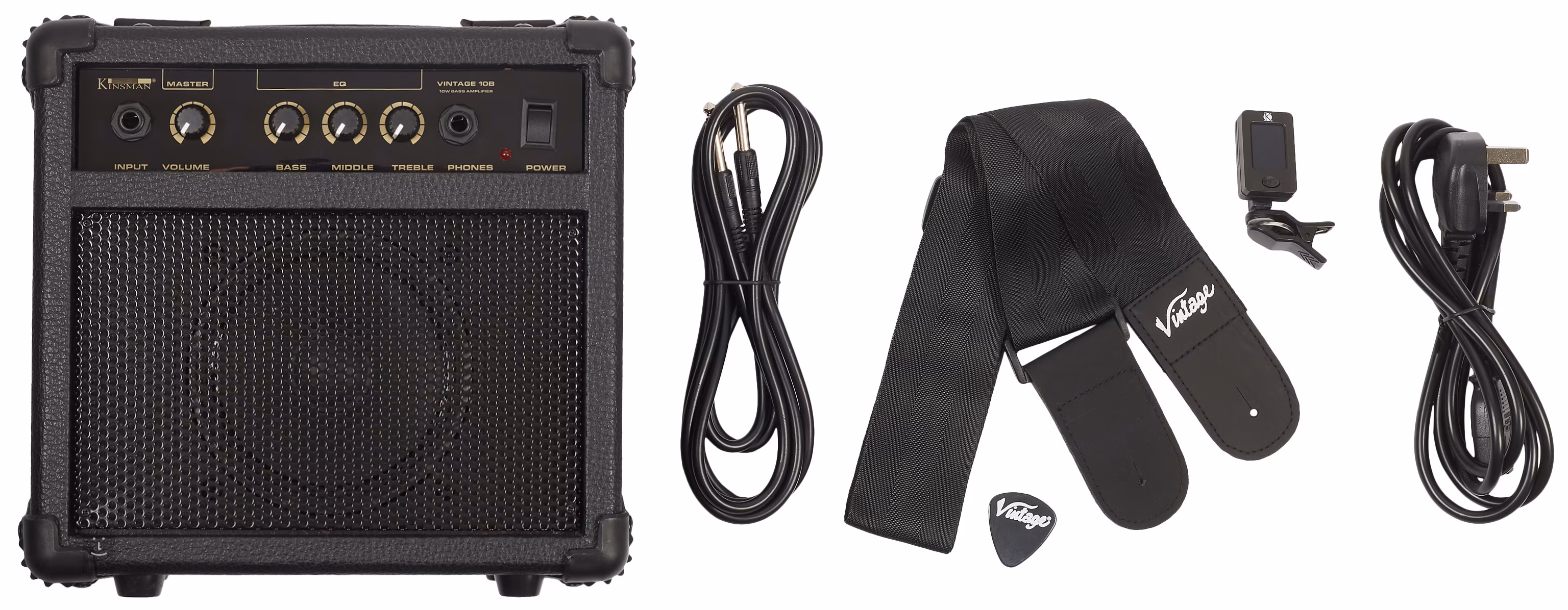 Vintage Coaster V40 je ideální jako první „seriózní“ baskytara pro rockové nadšence. Tento balíček je určen pro hráče, kteří chtějí mít vše, co potřebují k hraní. Vintage Coaster Series V40 Bass Guitar Pack, zahrnuje kromě baskytary i trsátko, popruh, sadu strun, obal, nástrojový kabel, klipovou ladičku a 10W zesilovač Kinsman s Master Volume a 3-pásmovým EQ.