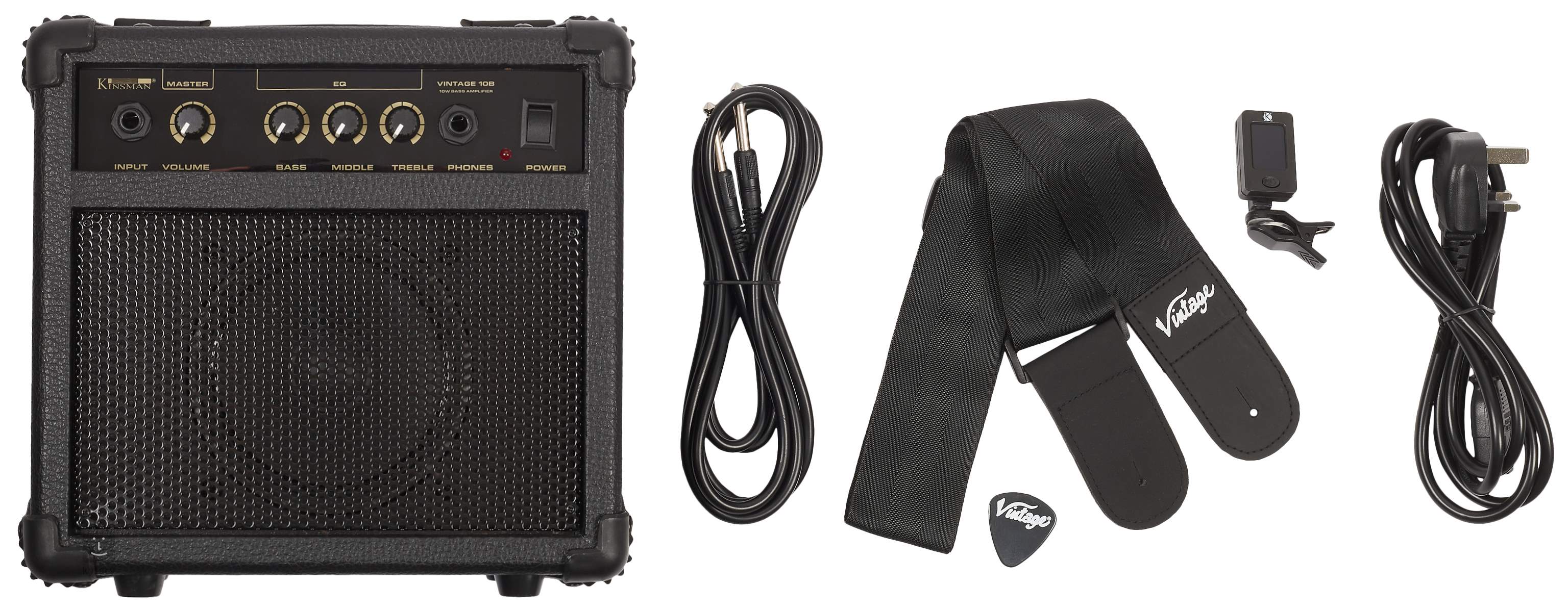 Vintage Coaster V49 je ideální volbou jako první „seriózní“ baskytara pro rockové nadšence, v tomto případě v kompletním balíčku, který muzikant potřebuje k životu. Balíček zahrnuje kromě baskytary i trsátko, popruh, sadu strun, obal, kabel, klipovou ladičku a 10W zesilovač Kinsman s Master Volume a 3-pásmovým EQ, což z něj dělá skvěle vybavenou sadu pro začínající hudebníky každého věku.