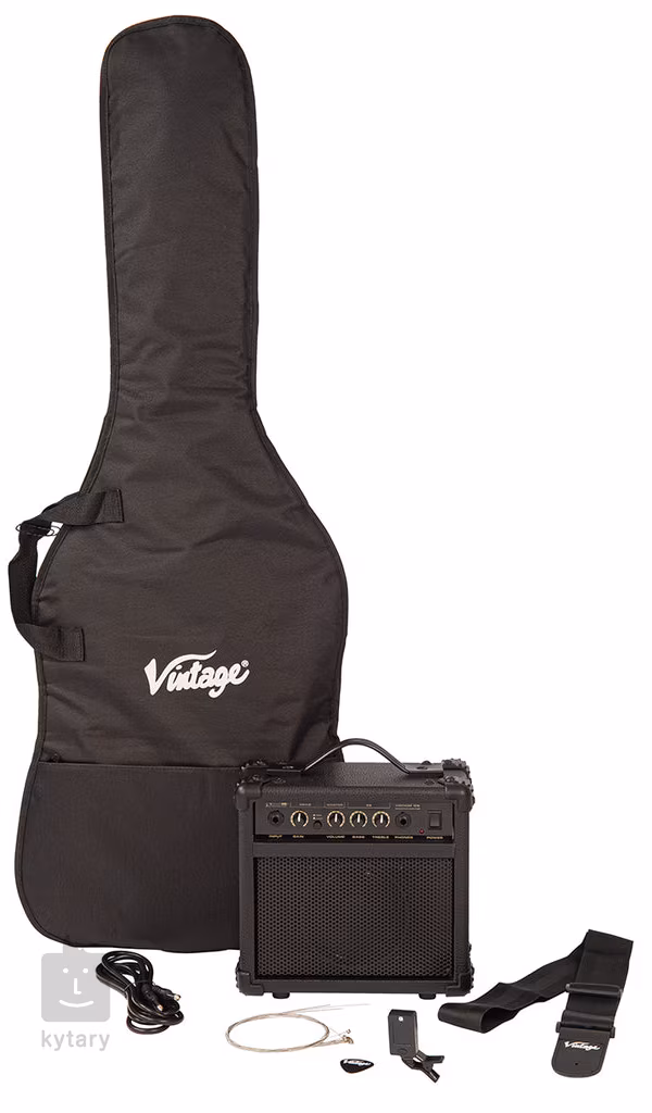 Kytarový komplet Vintage V60 Coaster Series Guitar Pack obsahuje elektrickou kytaru, kytarové kombo Kinsman s výkonem 10W, obal, kytarový popruh, nástrojový kabel, klipovou ladičku, trsátko a náhradní set strun.