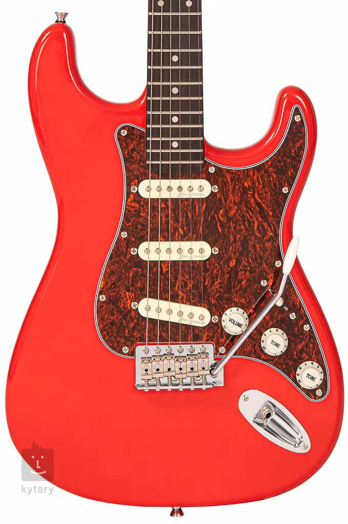 Struny jsou ukotveny v chromovaných Die-Cast mechanikách a vibratu s nastavitelnými sedly. Stylové zpracování podtrhují tradiční prvky v podobě třívrstvého pickguardu a pozičních teček na hmatníku.