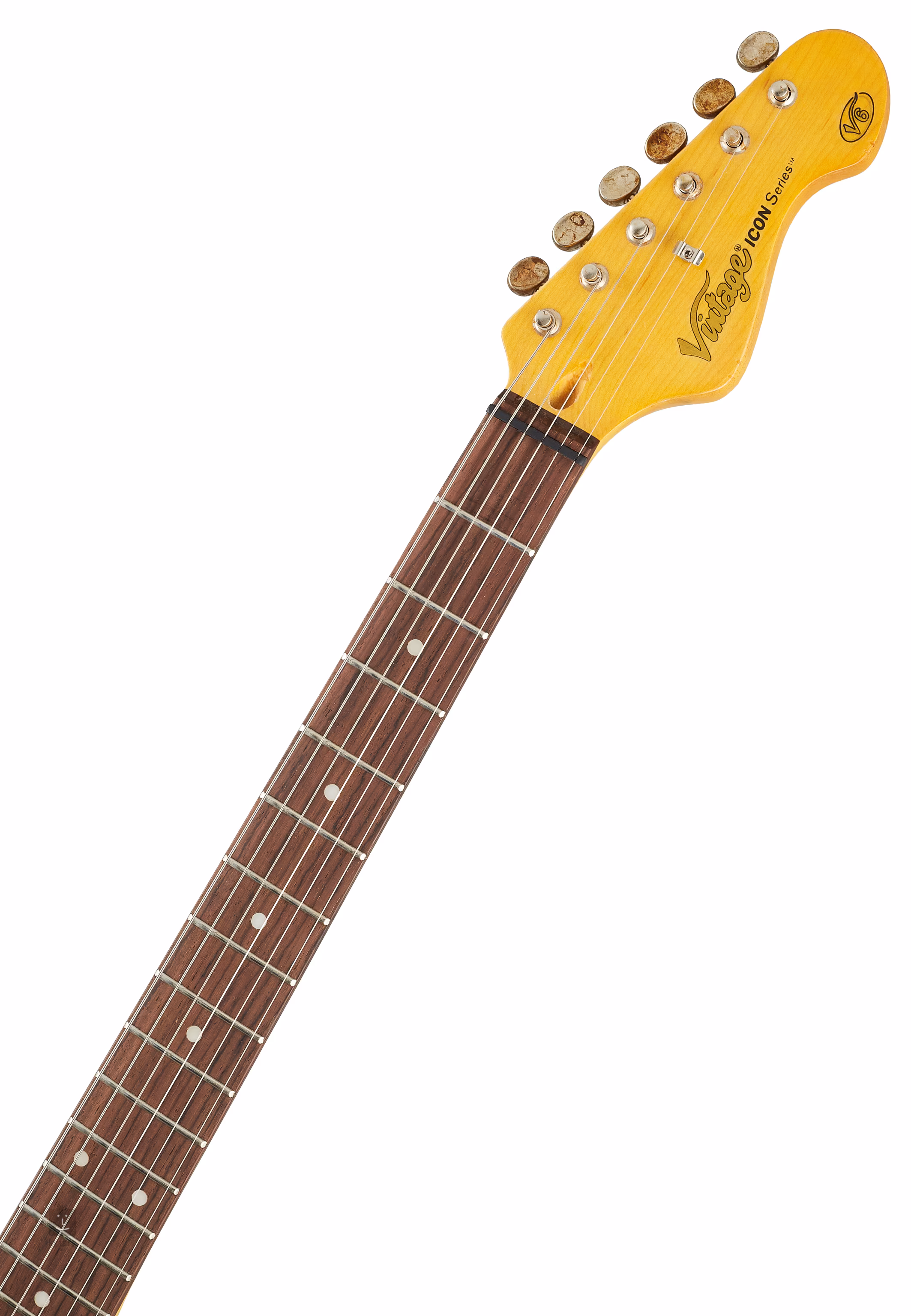 Elektrické kytary značky Vintage z řady ICON nabízí dotažený design a feel léty hraných nástrojů, tj. finiše s jemnějšími i výraznějšími prvky umělé patiny. Double-cut ST style model V6HMRLB se tak může pochlubit řadou bojových šrámů v podobě škrábanců, oprýskaného laku a výraznými prvky patiny veškerého hardware.