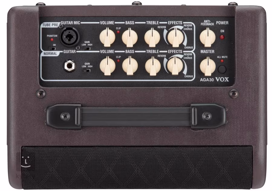 Mini kombo AGA30 se nyní přidává k respektované série VOX AGA aparátů pro akustické nástroje – AGA 70 a AGA150. Stejně jako jeho starší a silnější sourozenci, i AGA30 disponuje dvěma kanály: TUBE PRE s lampou 12AU7 v předzesilovači a NORMAL. TUBE PRE kanál slouží také jako vstup pro mikrofon, který lze i fantomově napájet. Oba kanály poskytují efekty reverb a chorus, které jsou nezbytné pro pravdivý akustický zvuk. Jednoduchý knob zároveň vybírá typ efektu (včetně kombinace chorusu a reverbu) a zároveň nastavuje jeho hloubku – čímž zjednodušuje celé ovládání této sekce. Tento kompaktní a jednoduchý aparát nabízí dokonalý zvuk do jakéhokoliv prostředí, ať už cvičíte doma nebo hrajete na menší štaci. Teď si můžete vzít hladký akustický zvuk aparátu AGA kamkoliv jenom jdete.