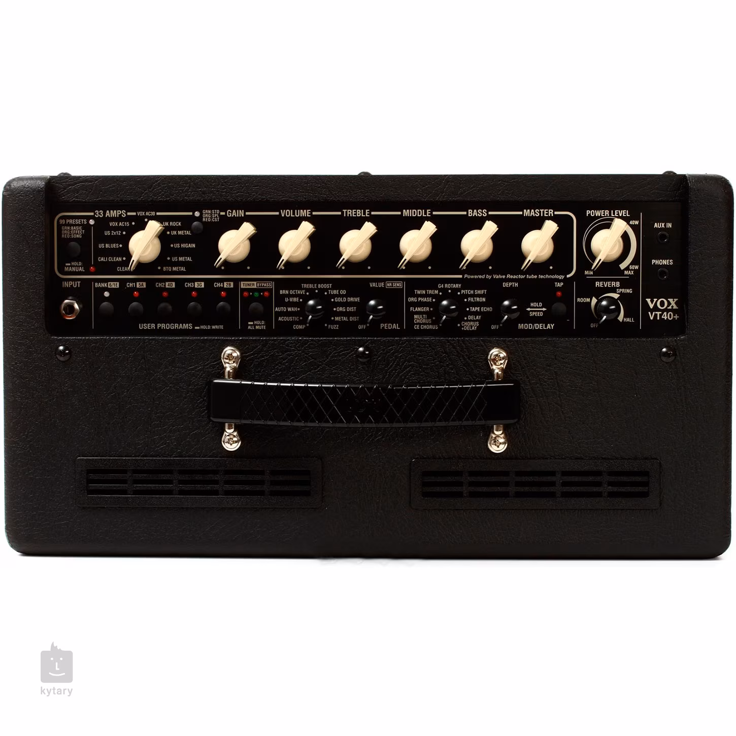 Pro ovládání samozřejmě slouží klasická sestava potenciometrů Master Volume, Gain, Bass, Middle a Treble. Pro noční tiché cvičení nebo pro nahrávání je VT vybaven sluchátkovým výstupem a navíc i Aux-In vstupem, což ho dělá vskutku ideálním pro mnoho užití.