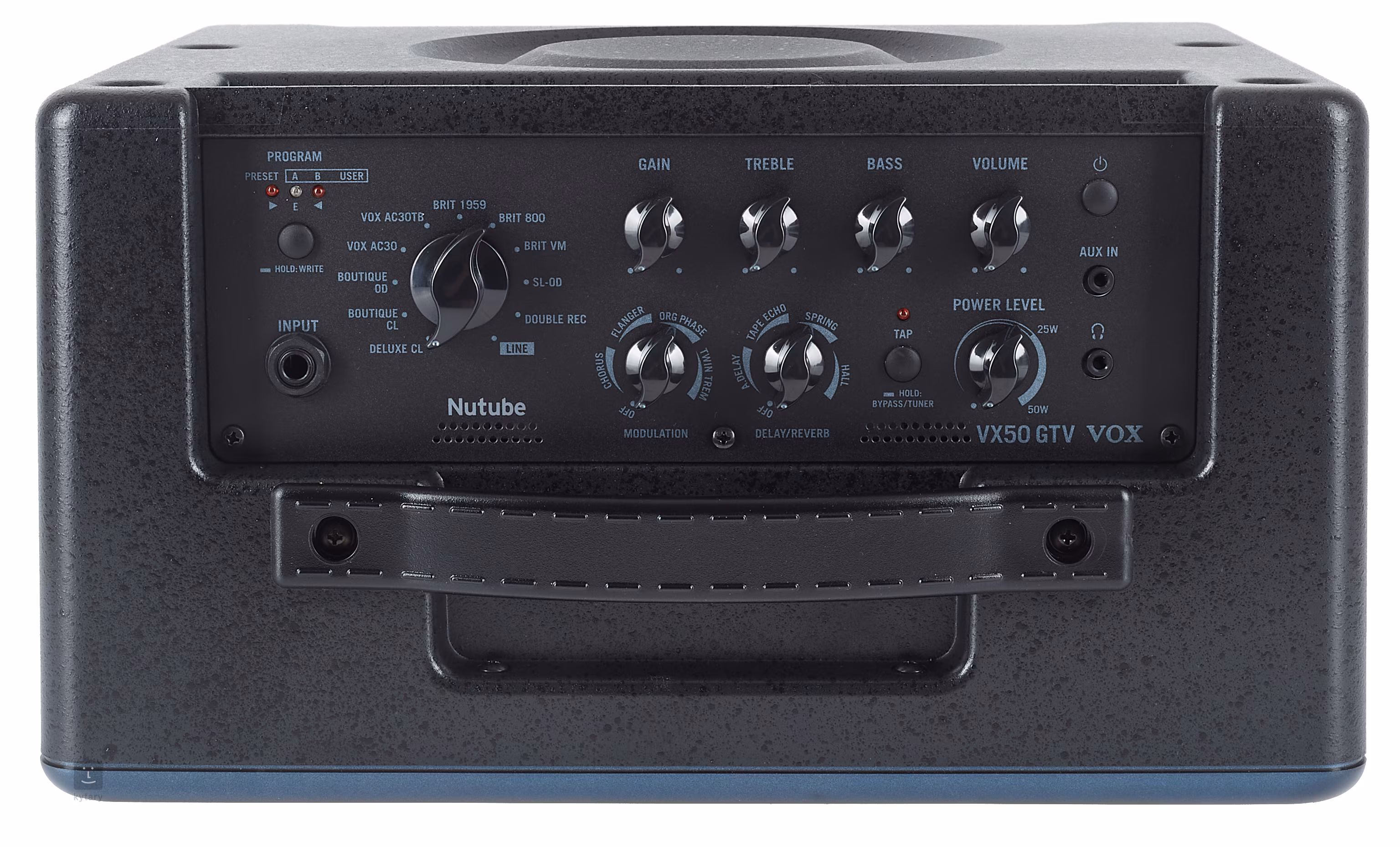 Kytarové modelingové kombo Vox VX50 GTV je větší verzí modelu VX15, oproti kterému disponuje nejen vyšším výkonem, ale i USB konektorem pro připojení k hudebním softwarům ve vašem PC. Nabízí jedenáct simulací kytarových aparátů zahrnujících slavné lampové modely (AC30), moderní hi-gain zesilovače, butikové aparáty a nový typ simulace Line umožňující ke kombu připojit akustické kytary/nástroje. Maximální autentičnost zvuku simulovaných aparátů zaručuje technologie VET (Virtual Element Technology) a vakuová elektronka nové generace Nutube, která reprodukuje dynamický charakter a feeling lampových zesilovačů včetně přirozeného zkreslení.