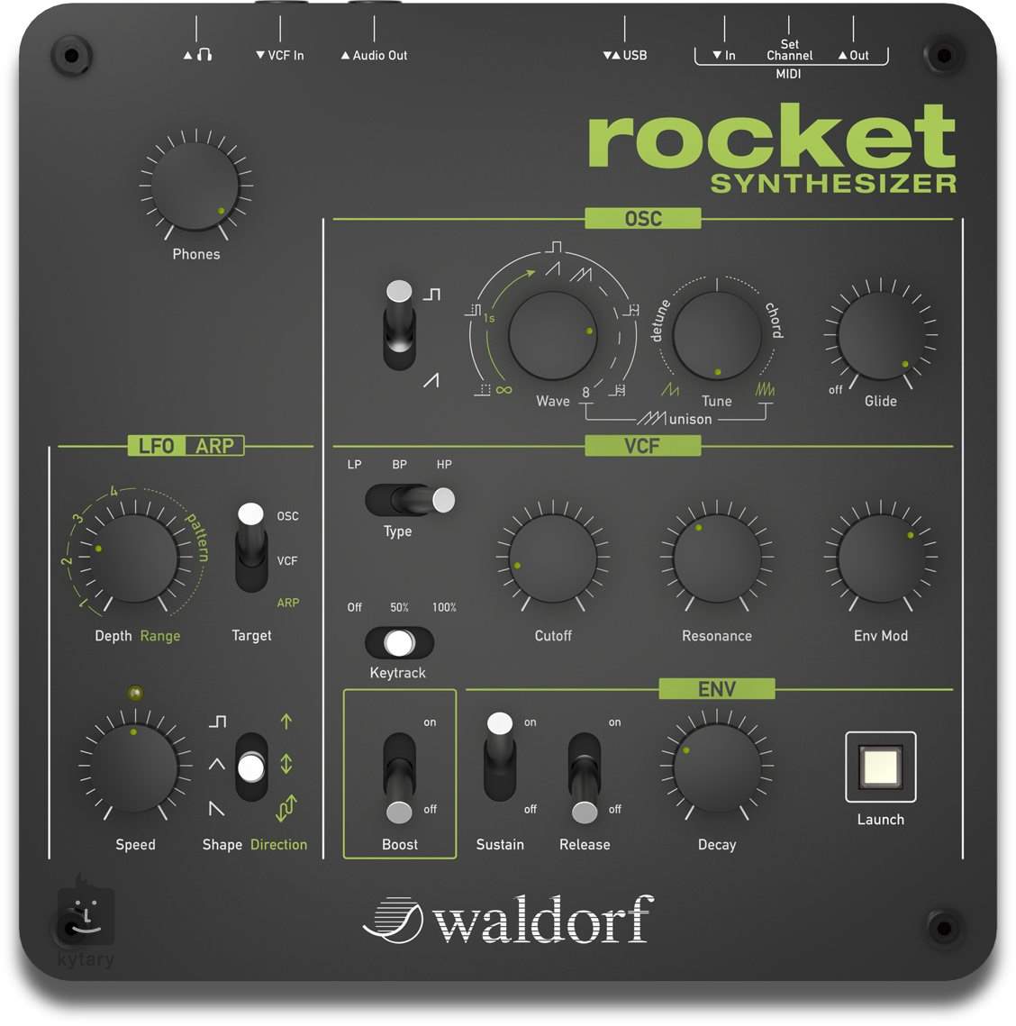 Plnohodnotný Waldorf syntezátor: silný, přímý a se spoustou lásky k detailu. Nikdo nečekal start této rakety (Rocket), který je v přímém rozporu s několika rezolucemi OSN i základními fyzikálními zákony. Na rozdíl od běžných raket, v tomto případě má raketa čtvercový tvar a bude prodávána po celém světě v naprosté nevědomosti Německé vlády. Má neuvěřitelný zvuk, je mnohem hlasitější, než legendární motor Saturn V a dosud nikdy si nikdo s raketou neužil tolik zábavy. Obsahuje analogový více-režimový VCF s dolní a horní propustí, rezonanci až k samooscilaci a moderní sekci monofonního oscilátoru s velmi jemným pilovitým tvarem. Dále je vybaven výkonným arpeggiátorem a destruktivním obvodem Booster. Tato raketa je technologicky na hony vzdálená všem obranným systémům. Rocket je ideální stroj pro zvukový design. Funguje buď jako jeden sólový nástroj a nebo se pohodlně začlení do jakéhokoliv hudebního produkčního prostředí. Ale jeho nejdůležitější vlastností je samozřejmě jeho zvuk.