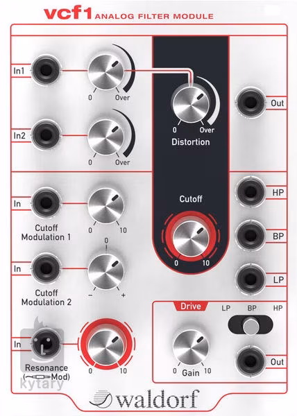Waldorf VCF-1 je analogový filtr s ořezem 12 dB na oktávu a zabudovaným Drive obvodem, který průchozí audio signál krásně zabarví. K dispozici jsou dva audio vstupy s nastavením gainu, napětím lze kontrolovat ořez a resonanci s možností samooscilace. Kromě hlavního výstupu nechybí konektory pro HP, BP a LP průběhy a samostatný výstup Drive obvodu.