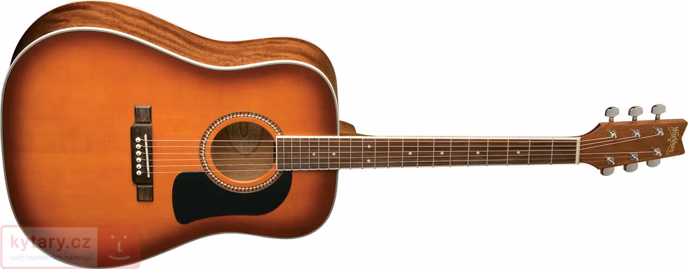 Akustická kytara typu Dreadnought, přední deska masivní smrk, luby a zadní deska mahagon, krk mahagon, ladící systém Buzz Feiten