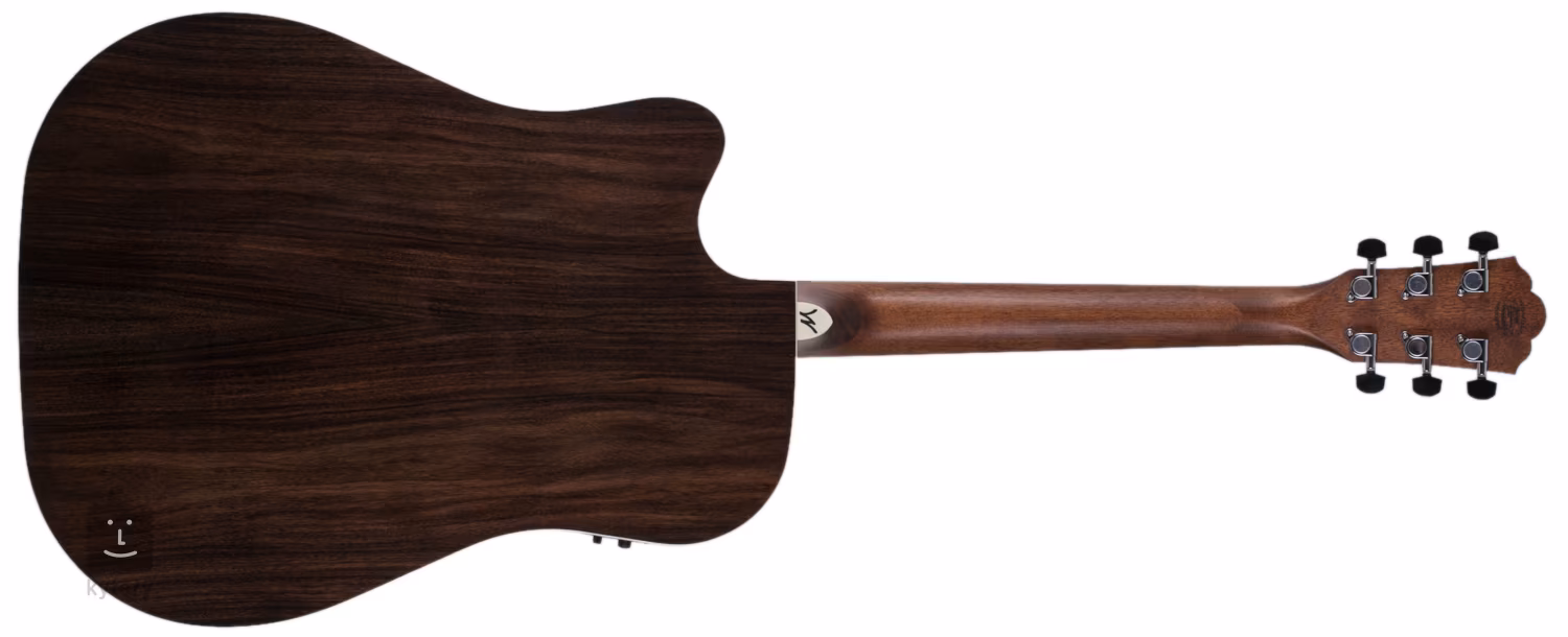 Přední deska této kytary je z masivního smrku Sitka, který zajistí perfektní tón a zároveň se s věkem bude čím dál více rozehrávat. Zadní deska a luby jsou z vyrobeny z exotického dřeva Pau Ferro, krk je mahagonový a prochází jím dvoucestná výztuha. Na hmatníku ze dřeva ovangkol najdeme 20 pražců, k orientaci slouží klasické tečky. Menzura nástroje odpovídá rozměru 643 mm, šířka nultého pražce z materiálu Nubone je 43 mm.