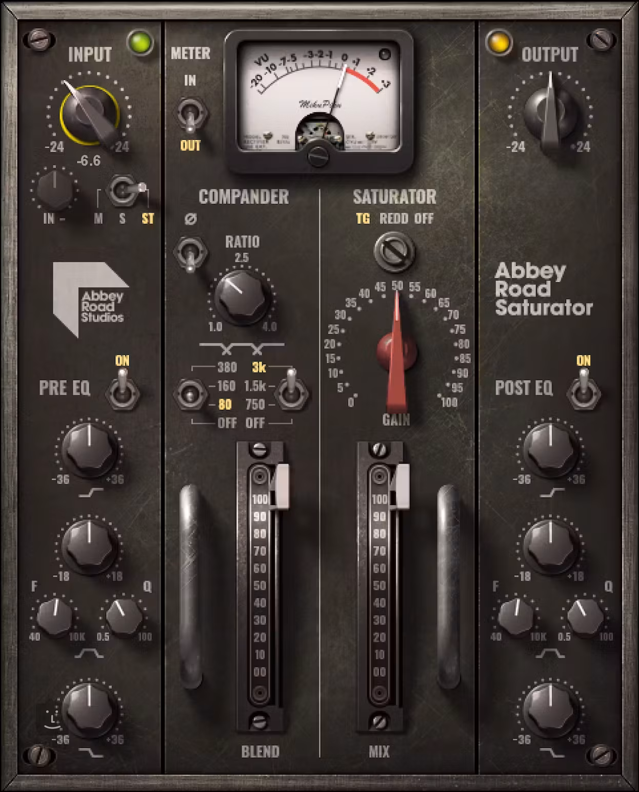Klasické elektronkové a polovodičové zkreslení Díky pluginu Abbey Road Saturator získáte komplexní možnosti pro nakreslení vašeho zvukového materiálu - od lehké saturace pro vynikající vokály nebo syntezátor, přes vyšší nasycení, které dodá basům a bicím hmatatelnou razanci, až po industriální chaos a vše mezi tím. Vyberte si lampový zvuk konzole REDD nebo kulatý, polovodičový tón TG12345. Přidejte pre- a post- saturační ekvalizér a pak celý řetězec vybudíte pomocí vzácné "tajné zbraně" TG12321 compander - nic nezní tak jako tohle.