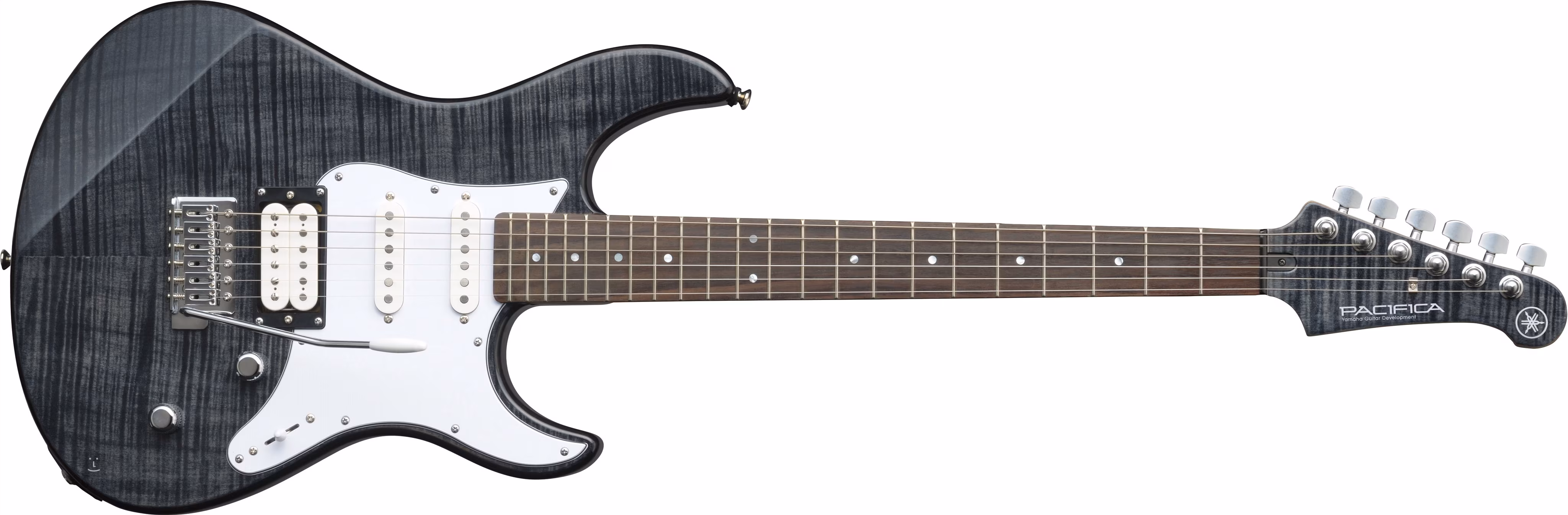 Olšové tělo elektrické kytary Pacifica 212VFM Translucent Black zdobí efektní vrchní dýha z fládrovaného javoru a lesklý polyuretanový lak. K javorovému krku je přilepen palisandrový hmatník osazený dvaadvaceti pražci velikosti Medium. “Medium C” profil krku, plošší rádius hmatníku a výřezy těla zaručují pohodlný pohyb a dohmat na celé ploše hmatníku.