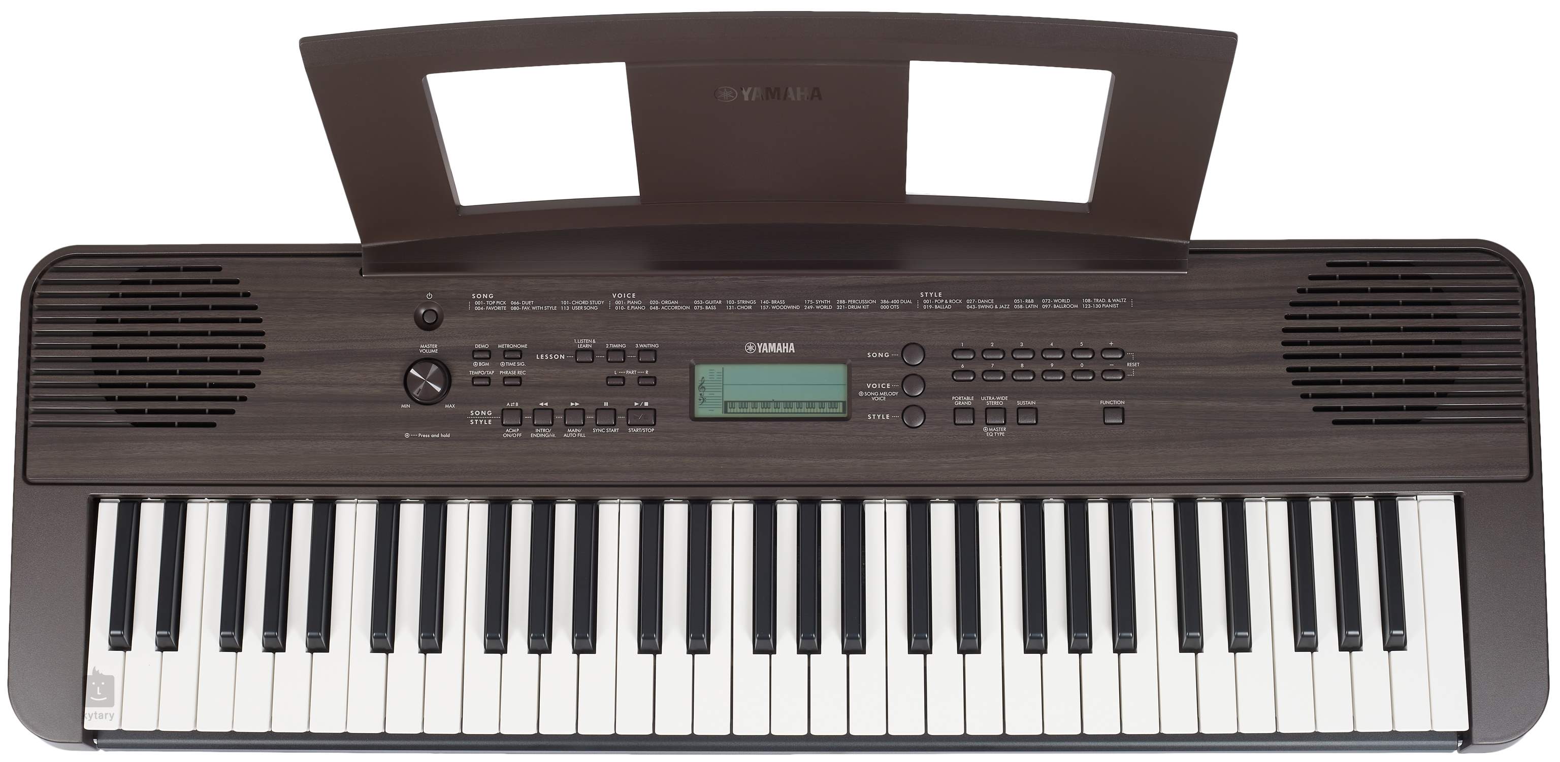 Zvuková banka nabízí 400 inspirativních nástrojů ve vysoké kvalitě, které lze dále upravovat podle aktuální potřeby, 130 automatických doprovodů a 112 skladeb vám umožní hrát prakticky jakýkoliv předvolený styl, který se přizpůsobí vaší akordické hře. Pro úpravu a vylepšení jednotlivých zvuků můžete využít 9 typů efektu Reverb navozující pocit ze hry v koncertním sále a 5 typů efektu Chorus, který dodá zvuku hloubku a rezonanci. PSR E360 je také vybaven 6 typy Ekvalizéru, kterým přizpůsobíte i ty nejjemnější nuance zvuku a snadno tak dosáhnete přesně takového zvuku, jaký se vám líbí. Klávesy také disponují funkcí rozdělení klaviatury SPLIT, či funkcí DUAL, kdy můžete vrstvit dva zvuky na sebe a funkce DUO, kde se klaviatura rozdělí do dvou identických částí a která je tak ideální pro učení a hru dvou hráčů.