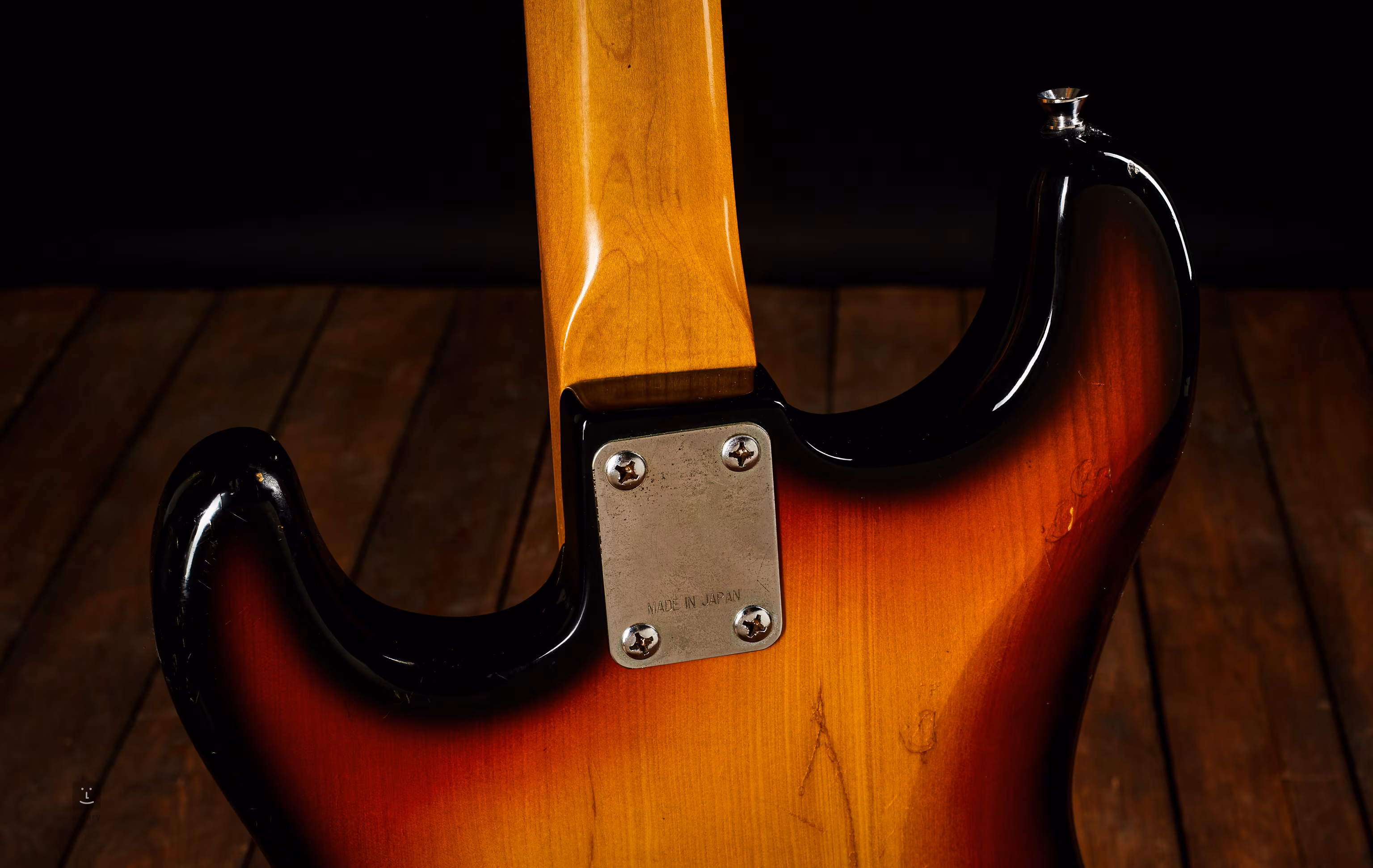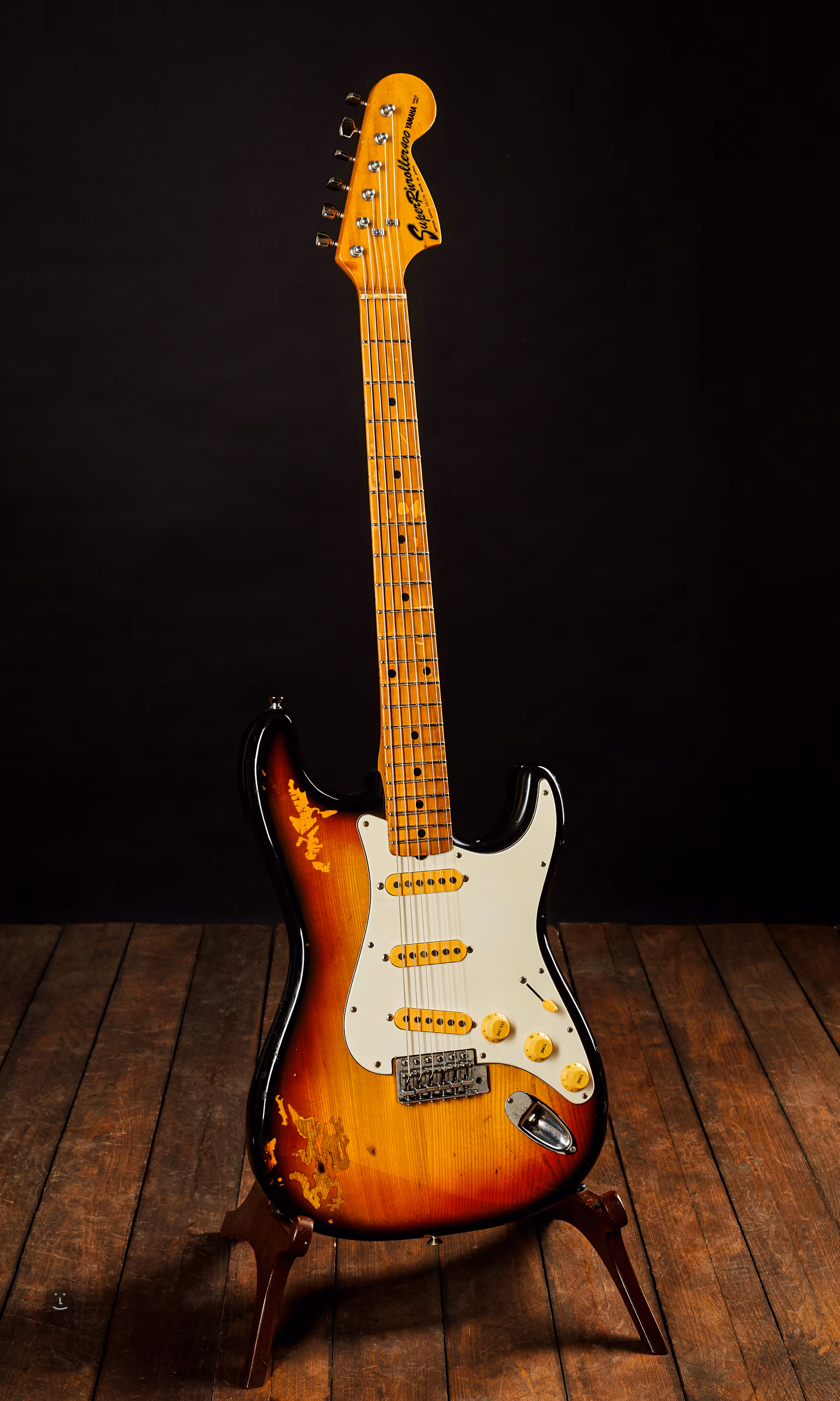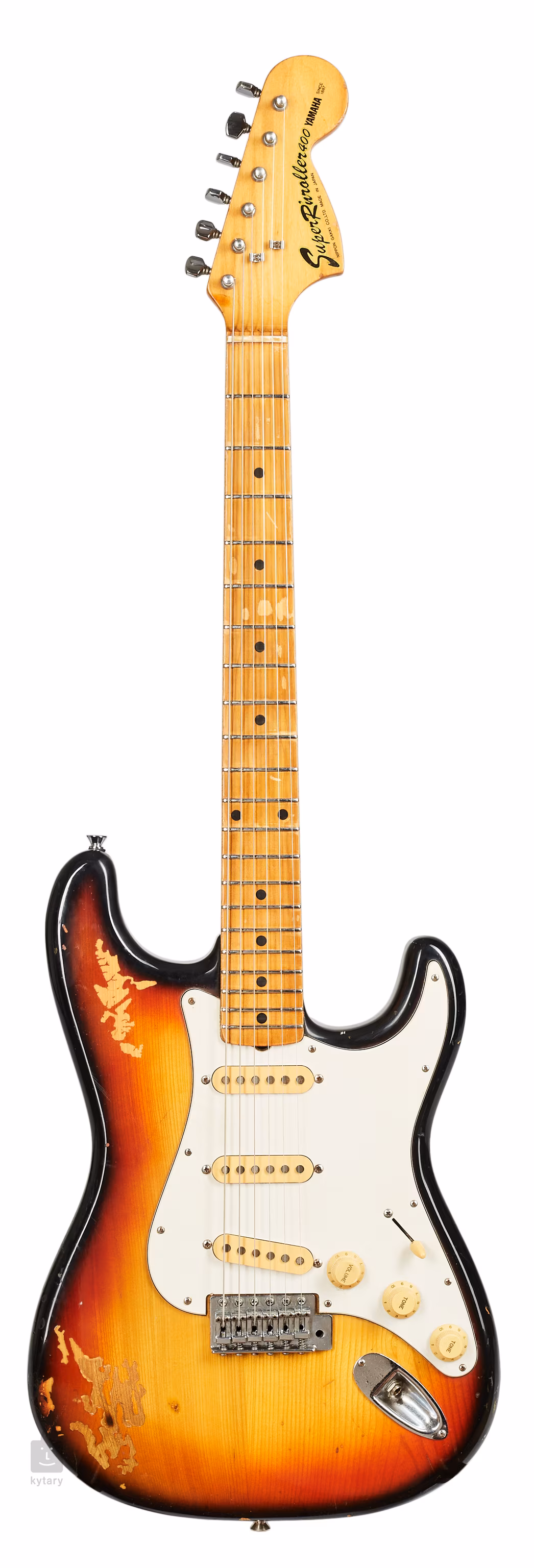 Lawsuit japonský stratocaster Yamaha SR400 ze 70. let. Tělo z japonského senu, krk z javoru. Klasické uspořádání trojice single snímačů.