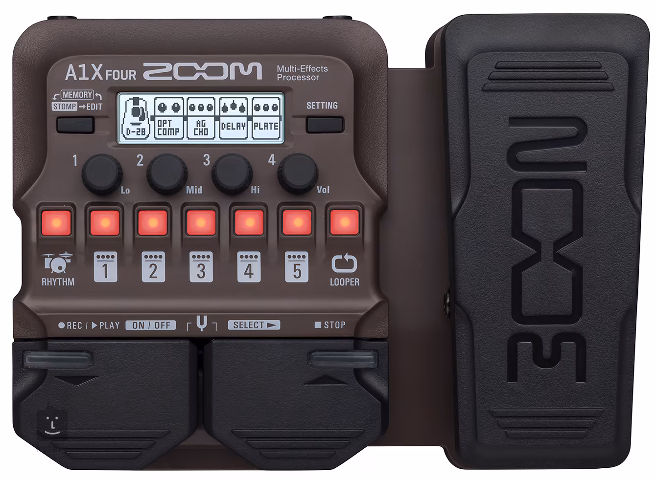• Ovládání 1x Expression, 2x FS, Knobs: Lo, Mid, Hi, Vol, Buttons: 1-5, Rhythm, Looper, Memory/Stom/Edit, Setting