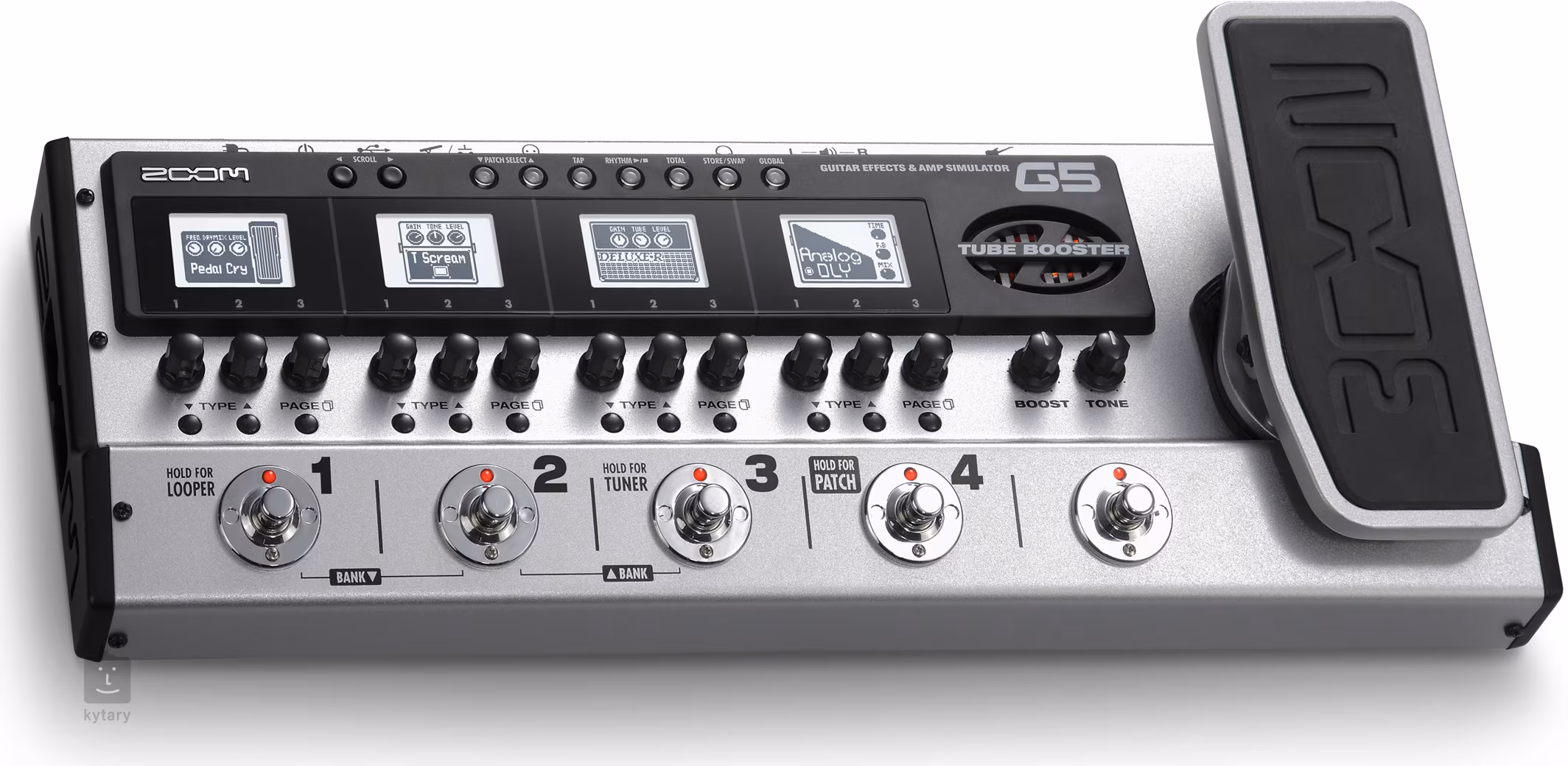 G5 je v podstatě rozdělen do 4 sekcí, z nichž každý funguje jako samostatný pedál – má vlastní ovládání, vlastní spínač, vlastní display. Díky tomuto řešení je práce s multiefektem opravdu intuitivní. Jako poslední sekce je zde lampový booster a ovedrive.